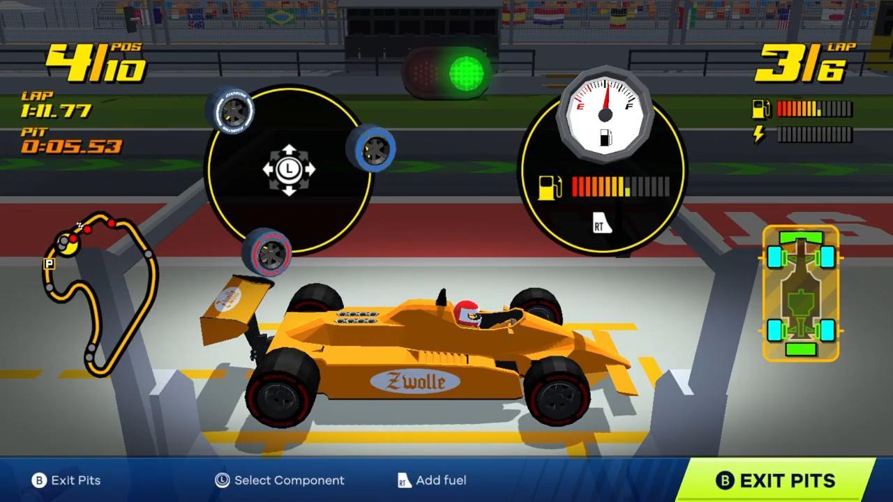 開賽前,工程師會先為你做簡報,玩家可以根據簡報中提出的賽道特性和當天天氣,決定開場要加多少油,並在軟胎、硬胎和雨胎中做選擇;比賽中,玩家得靈活運用類似DRS系統的氮氣加速,搭配尾流在直線與彎道上完成超車;同時觀察其他車手的進站策略,判斷天氣變化,掌握進站加油換胎的最佳時機。