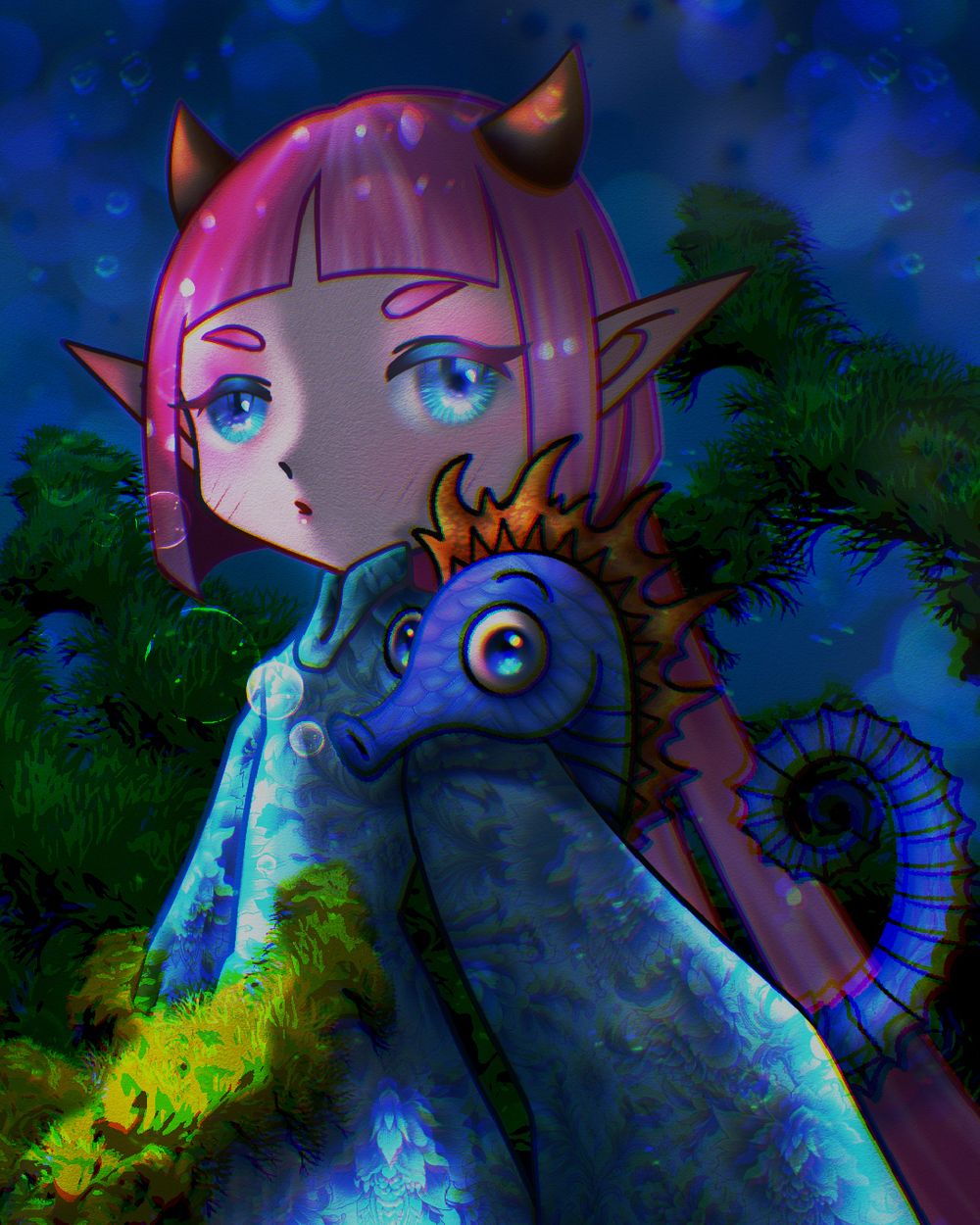 ——粉色短髮的小角精靈和她的泡泡馬一起巡遊海底花園。每一步都帶起一串閃亮的泡泡,好像在海裡撒下星星。