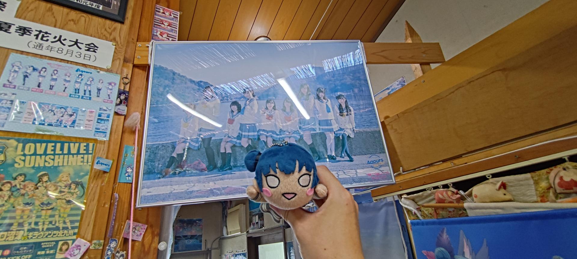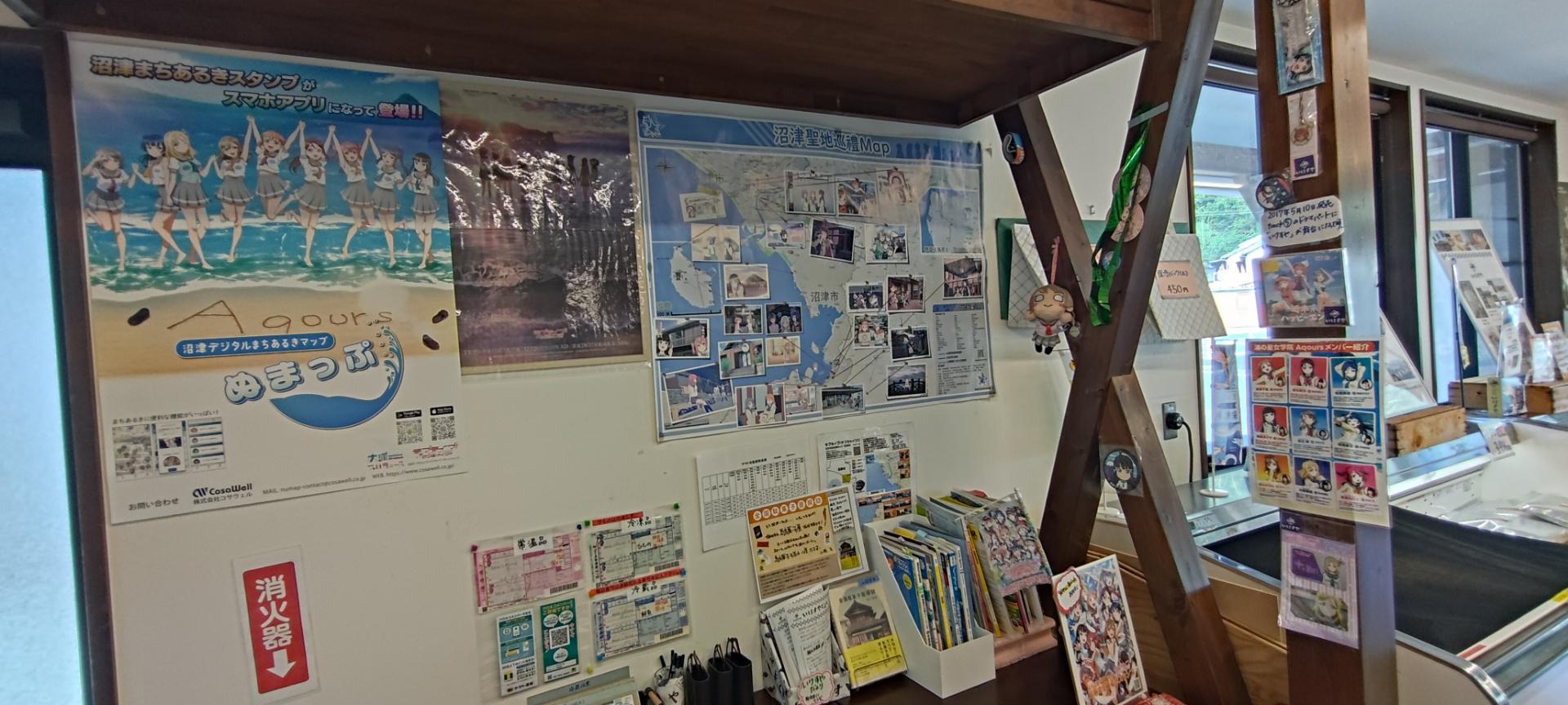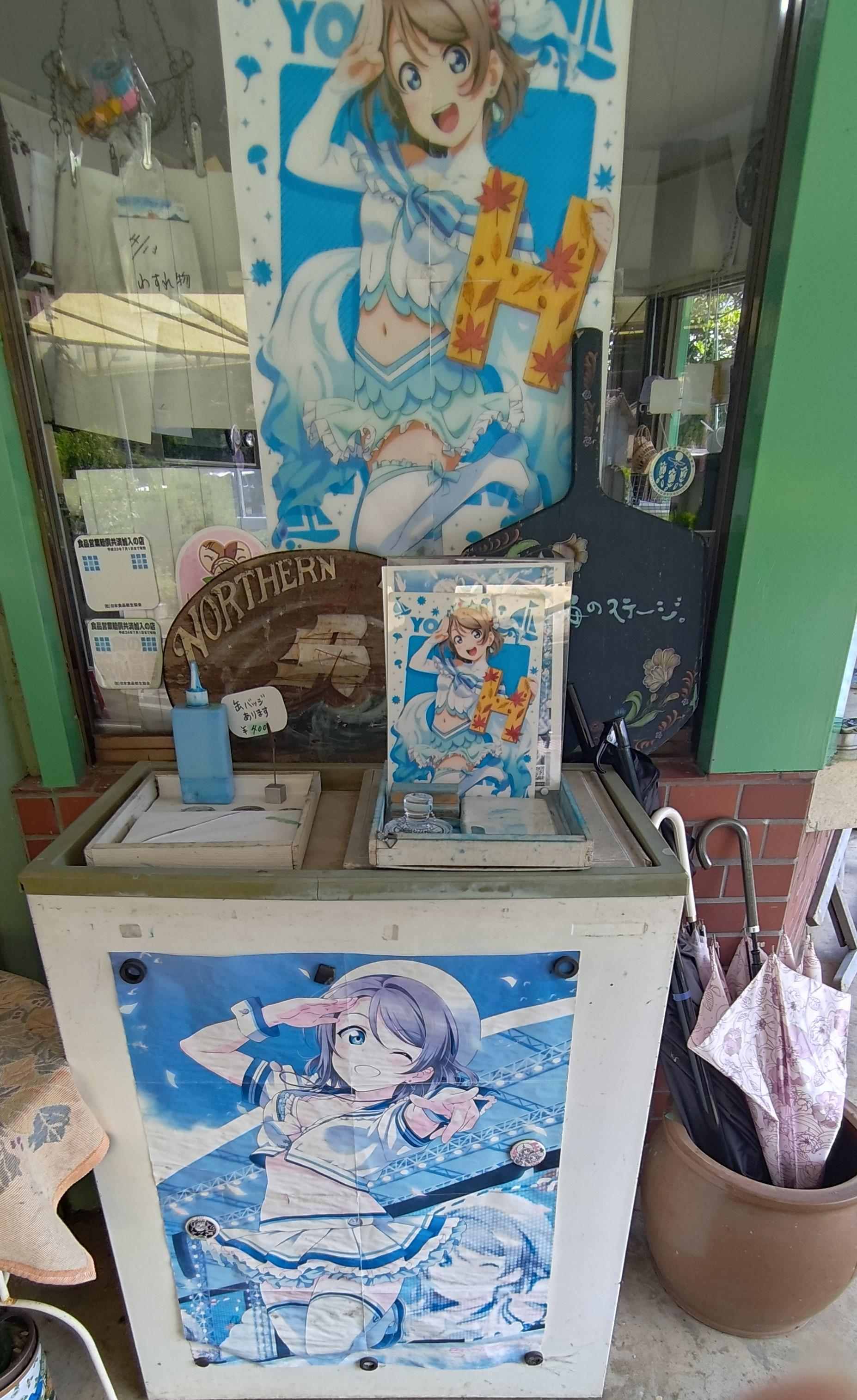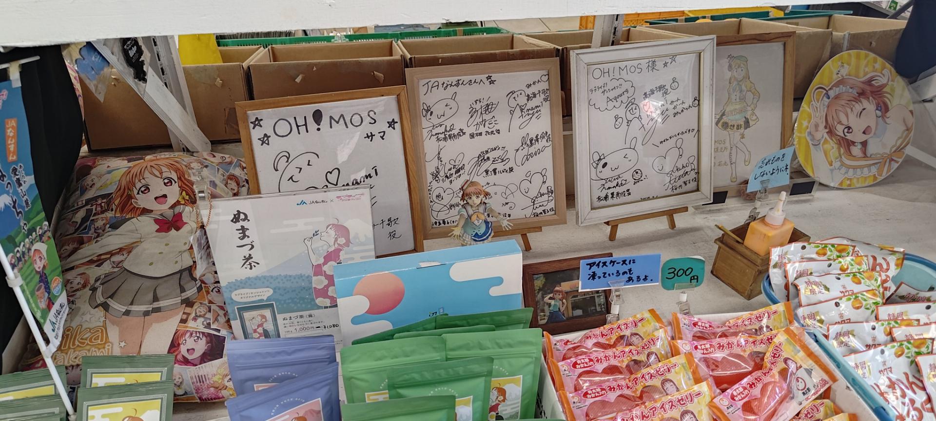 4.JAふじ伊豆 OH!MOS(オーモス):前面在學校那邊遇到來自洛杉磯的千歌推,我們倆就一起同行,對一個很久沒用英文的我來說,真的感覺到有點生疏。去玩神社後,原本打算去長濱城遺跡那邊,但我們倆都累了,就到對面的伊豆 OH!MOS稍作休息。那家店的阿婆很有趣,我們什麼都沒說,坐在店外休息喝果汁時候,拿著東西說可以拍照,我們一看這不是第一季第一集時,千歌募集成員時的東西嗎?