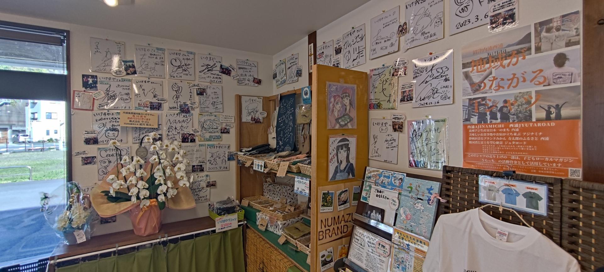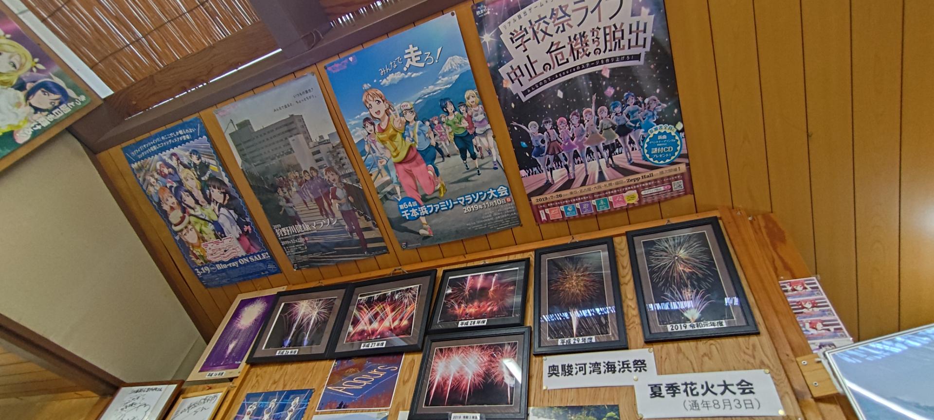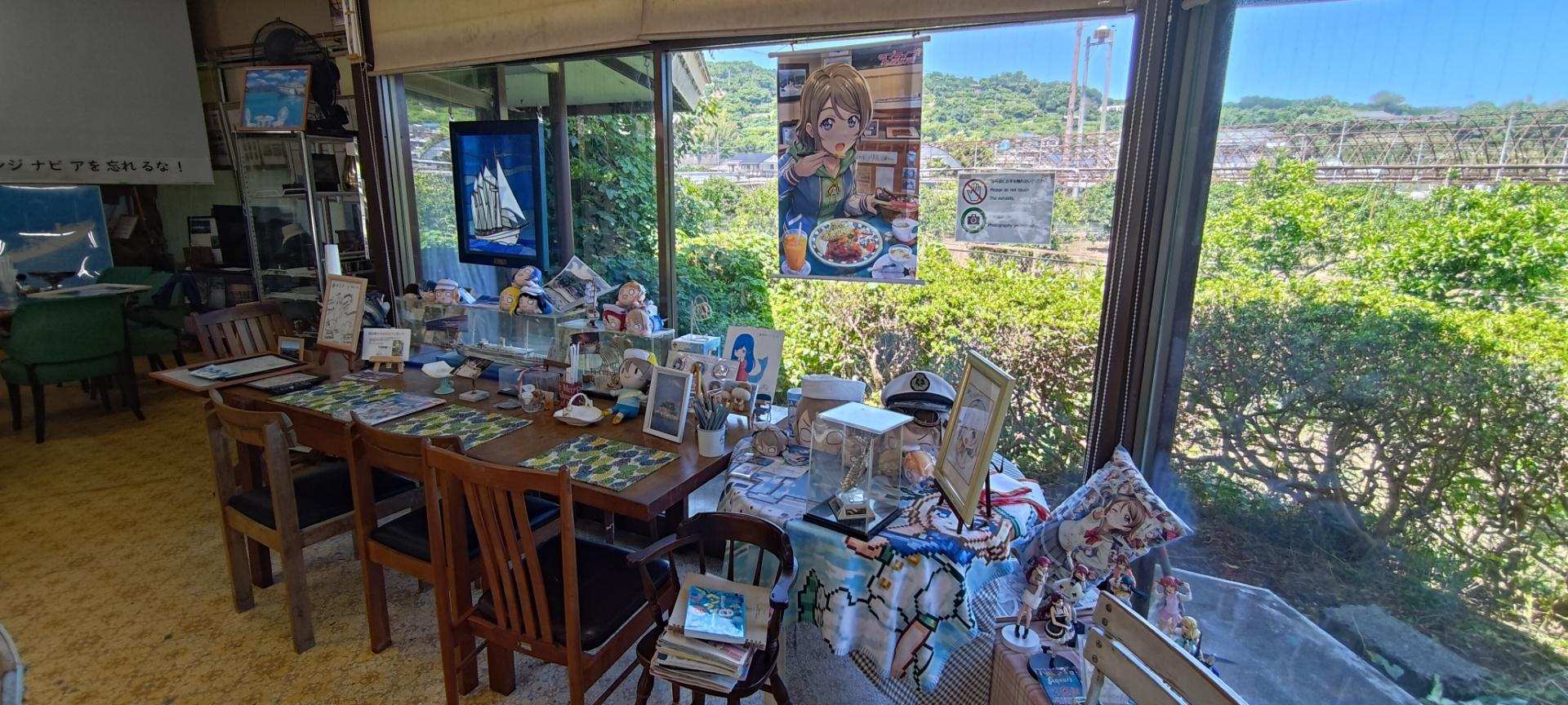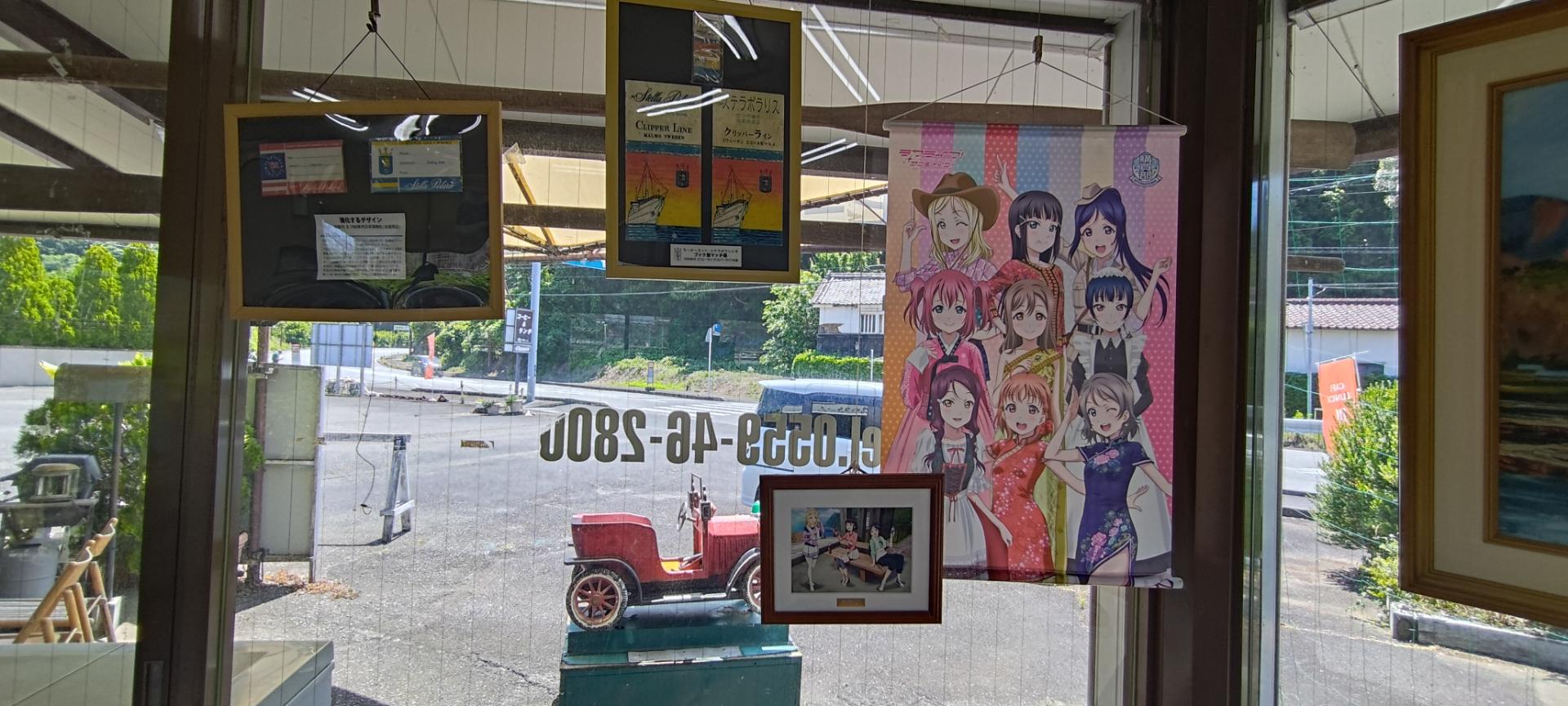 4.JAふじ伊豆 OH!MOS(オーモス):前面在學校那邊遇到來自洛杉磯的千歌推,我們倆就一起同行,對一個很久沒用英文的我來說,真的感覺到有點生疏。去玩神社後,原本打算去長濱城遺跡那邊,但我們倆都累了,就到對面的伊豆 OH!MOS稍作休息。那家店的阿婆很有趣,我們什麼都沒說,坐在店外休息喝果汁時候,拿著東西說可以拍照,我們一看這不是第一季第一集時,千歌募集成員時的東西嗎?