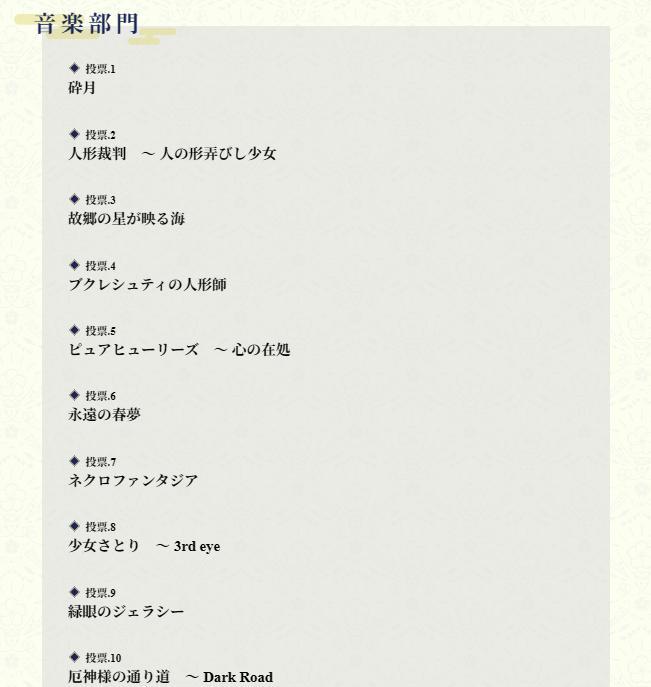 第二名開始就很難選了,去年的我選擇了necro fantasia,但今年我更喜歡人形裁判一點,完全打臉了去年的我。今年我試著把明明挺喜歡,但就是沒有排上榜的原曲都找來聽個一遍,而最後第十名我很糾結,究竟該選不思議之國的愛麗絲,厄神様の通り道 ~ Dark Road,還是明日ハレの日、ケの昨日或リジッドパラダイス,最後那首是宮古芳香的曲子。今年我聽到了非常喜歡的芳香二創曲,但我實際聽過原曲後並沒有到特別喜歡,於是幾經衡量,還是選擇了厄神通道。
