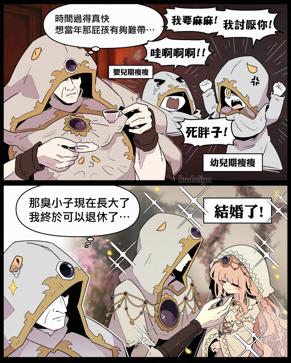 胖胖,帶著年幼的瘦瘦,一同熬過了失去女王後最艱難的那段時光,熬過了破碎戰爭,看著弟弟慢慢成長,在褪色者的協助下,黃金律法時代結束,交界地的星空被解放,黑焰再次得到命定之死,弟弟找到了幸福,成家立業,而自己似乎也能迎來光榮退休的時光了。