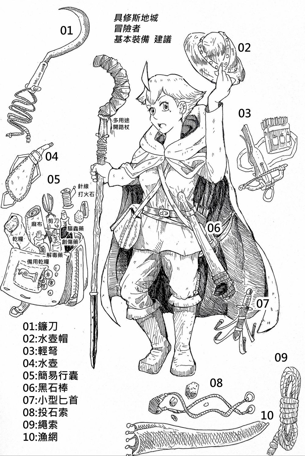 05:行囊就比較重要了,其中冒險者三寶一定要帶;驅蟲藥,創傷藥,解毒劑。 接著是乾淨的麻布和針線剪刀,大約五天份的乾糧,以及放在暗袋裡的備用,超乾口糧(平時可以藏錢喔)