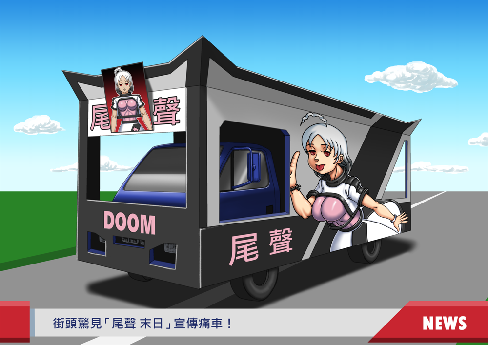 為了宣傳虛擬偶像「尾聲 末日」,本工作室特別砸下重金製作「痛車」近期將會出現在各大路口,歡迎大家踴躍拍照並打卡上傳網路,幫忙宣傳 ––––––– 尾聲 末日!