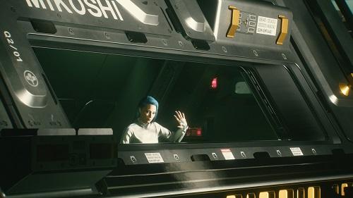 在服用「假內三氮雜苯」,到「御輿」內後,和「艾特」與「V」對話到最後選「我跟艾特走,你活下去」。