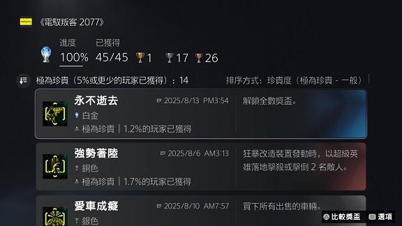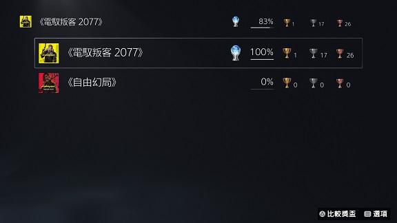 我用PS5玩PS4版,很不穩定,有時候一小時內遊戲當機2到3次,到白金至少當過數十次,PS5版也會,但沒那麼嚴重,大概到白金約當過4-5次,雖然有自動紀錄,還是建議要常手動紀錄。白金只要一輪,沒有難度獎盃,在最低難度玩即可,PS4版主要是技能綁特質點數及等級,沒到那等級無法使用某些技能及達不到那等級,PS5版整個改掉設計,技能和特質是分開來看,所以相對比較不用擔心沒點對特質,這遊戲也是我第一款PS4版和PS5版內容不太一樣,DLC也只有PS5版才有。遊戲最耗時獎盃就是解特別角色的支線獎盃、清地圖上的委託和NCPD密報等,戰鬥類獎盃都不算難解,收集要素有塔羅牌、強尼的遺物、快速傳送點等,還有4種結局獎盃。整體而言,我很推薦本作品,我玩得很開心。