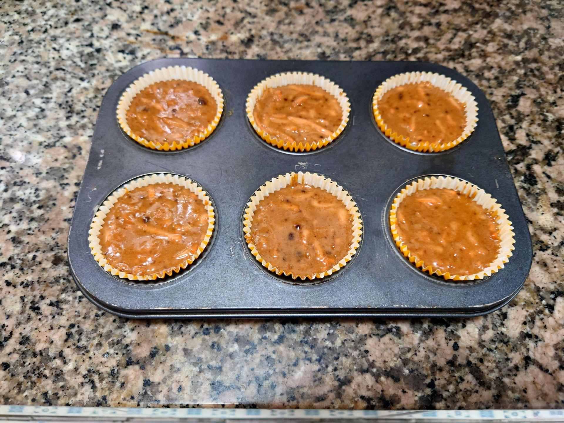 做法很簡單,把胡蘿蔔刨絲後,再把上述材料過篩,一一加入盆裡,攪拌均勻。這次用的模具是杯子蛋糕,裝約九點五分滿;再塞入烤盤。