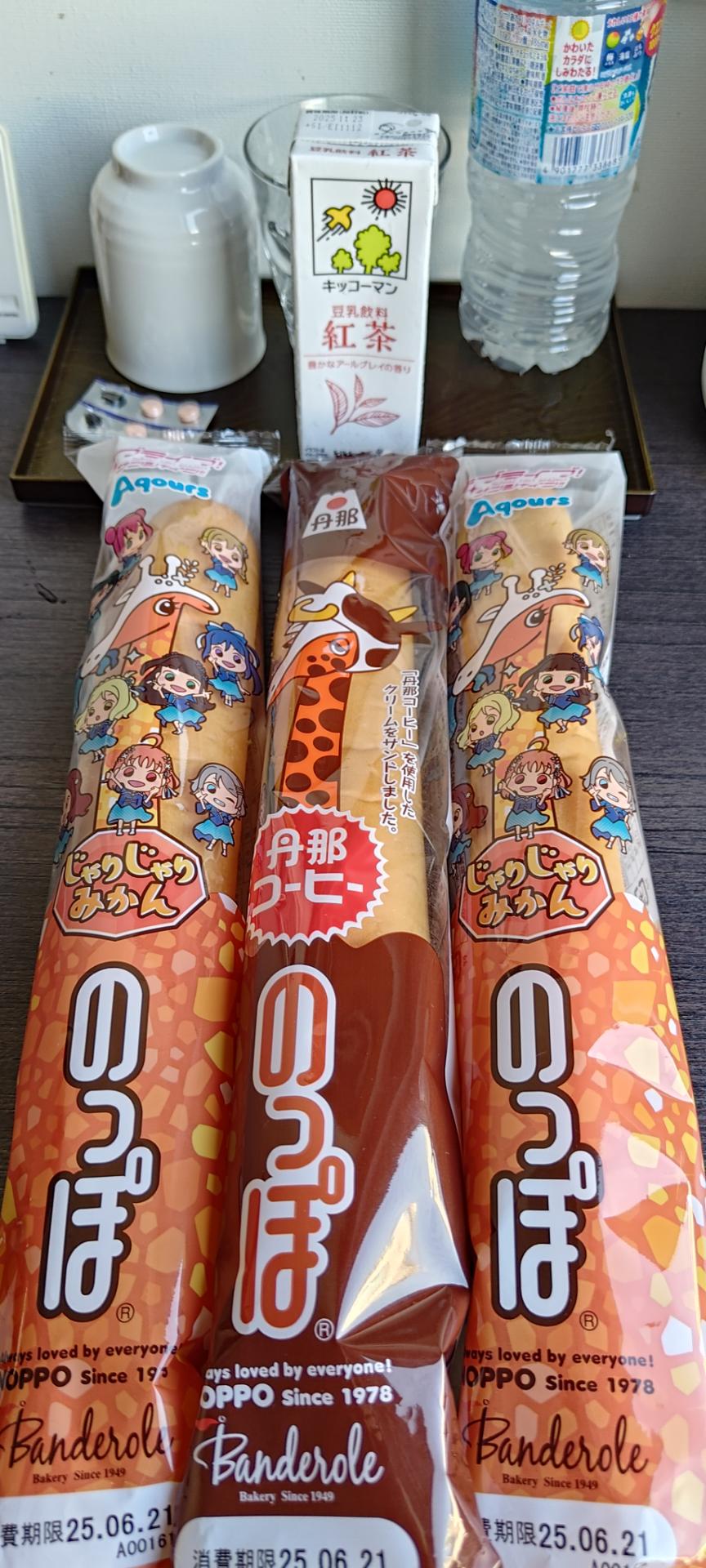 第四天,跟前一天一樣,起了早去沼津車站南口買到長頸鹿麵包,尤其是外包裝是水團九人的插圖,順便問了鋪貨的大叔,有沒有推薦的口味,他指著咖啡口味,我也試著吃吃看,嗯真的好吃!對了,鋪貨時間為早上7:30~8:00的時間點,所以要買的,鬧鐘記得設定好,有極大機率很快就沒有。