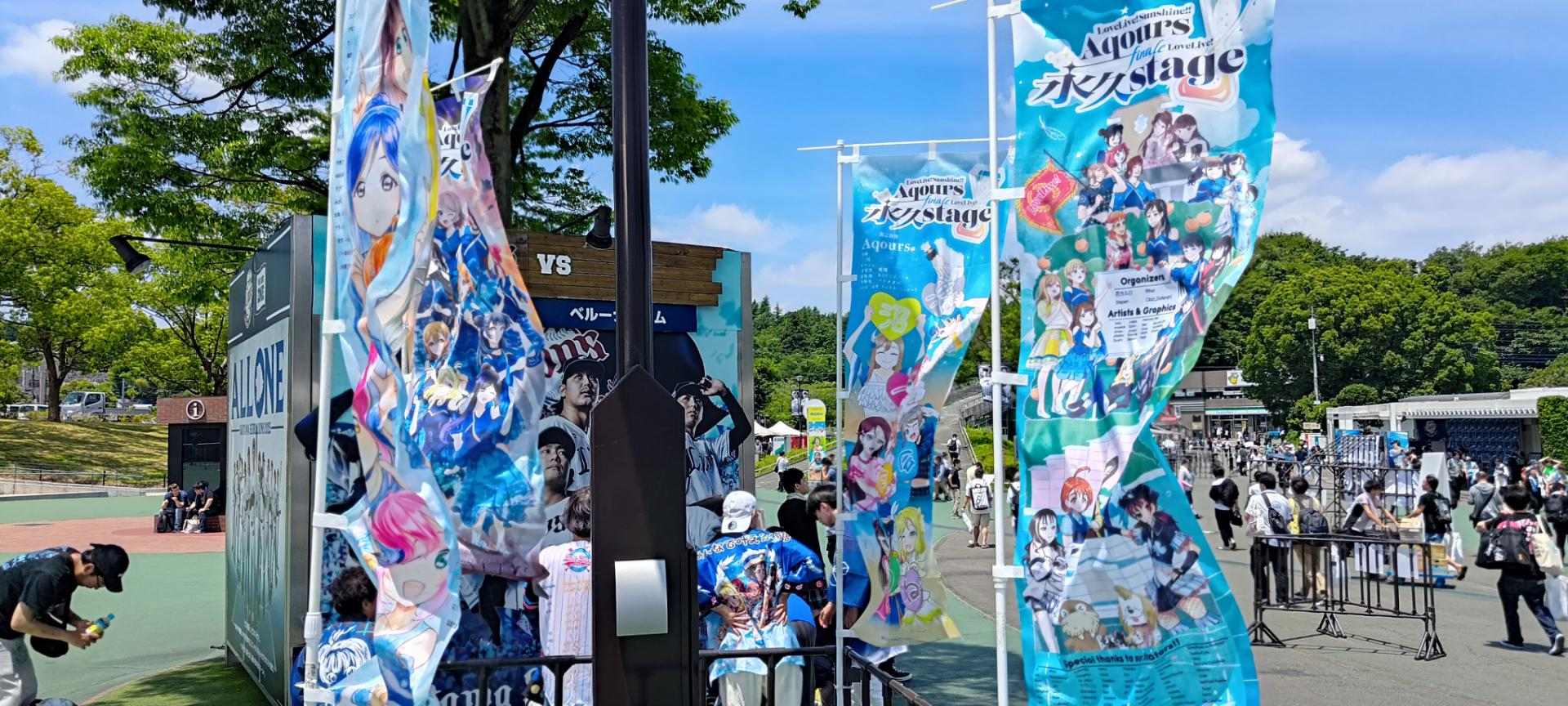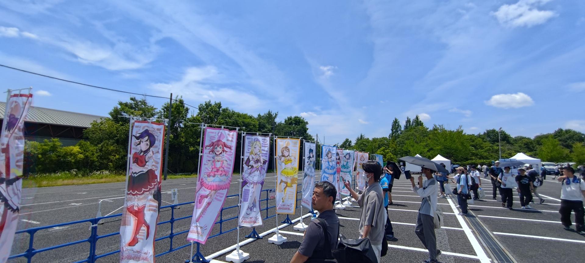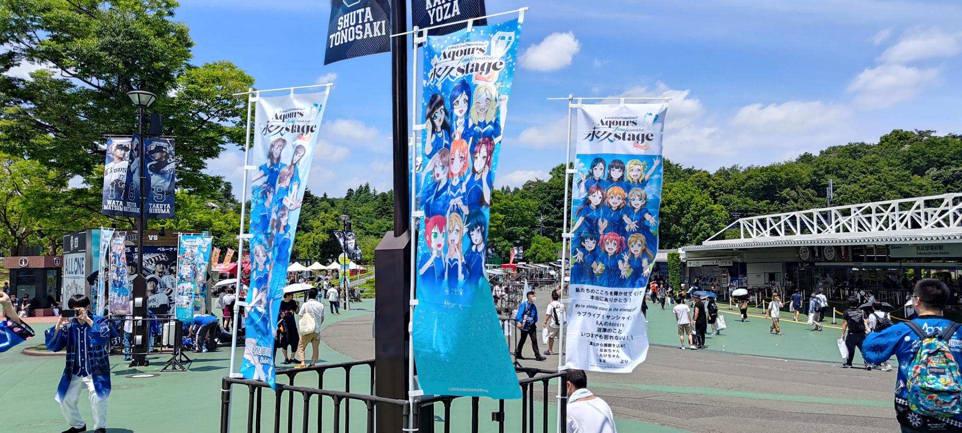 休息降溫後,去附近逛逛,不僅看到沼津地方商家送來的花籃拍照、還有粉絲投稿的旗幟,但礙於巴哈空間,我只放圖片就好。當然有也拍到所為應援手燈的活動,也就是根據我們坐的位置去點亮某個成員的代表色,這點在日本是很常見的應援行動。