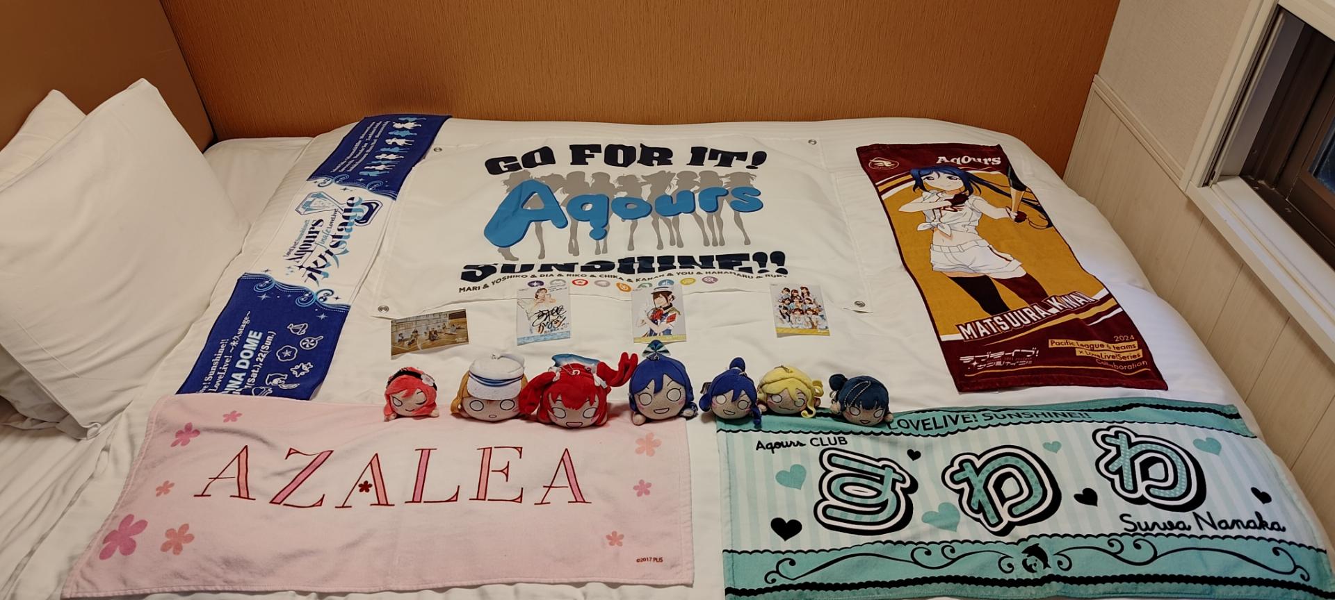 買了 shake shack當晚餐(真心推薦)後,準備回去旅館,看DAY1的轉播,還好我有先在台灣買好轉播,原本以為在日本看是否會擋起來,結果用手機投影到旅館電視,沒有任何問題。我只知道那天,一開始小宮有紗出來在沙灘上寫下AQOURS,我開始落淚了。然後轉播前把帶來的水團趴趴以及應援物都放在床上,邊看邊揮舞著應援手燈。