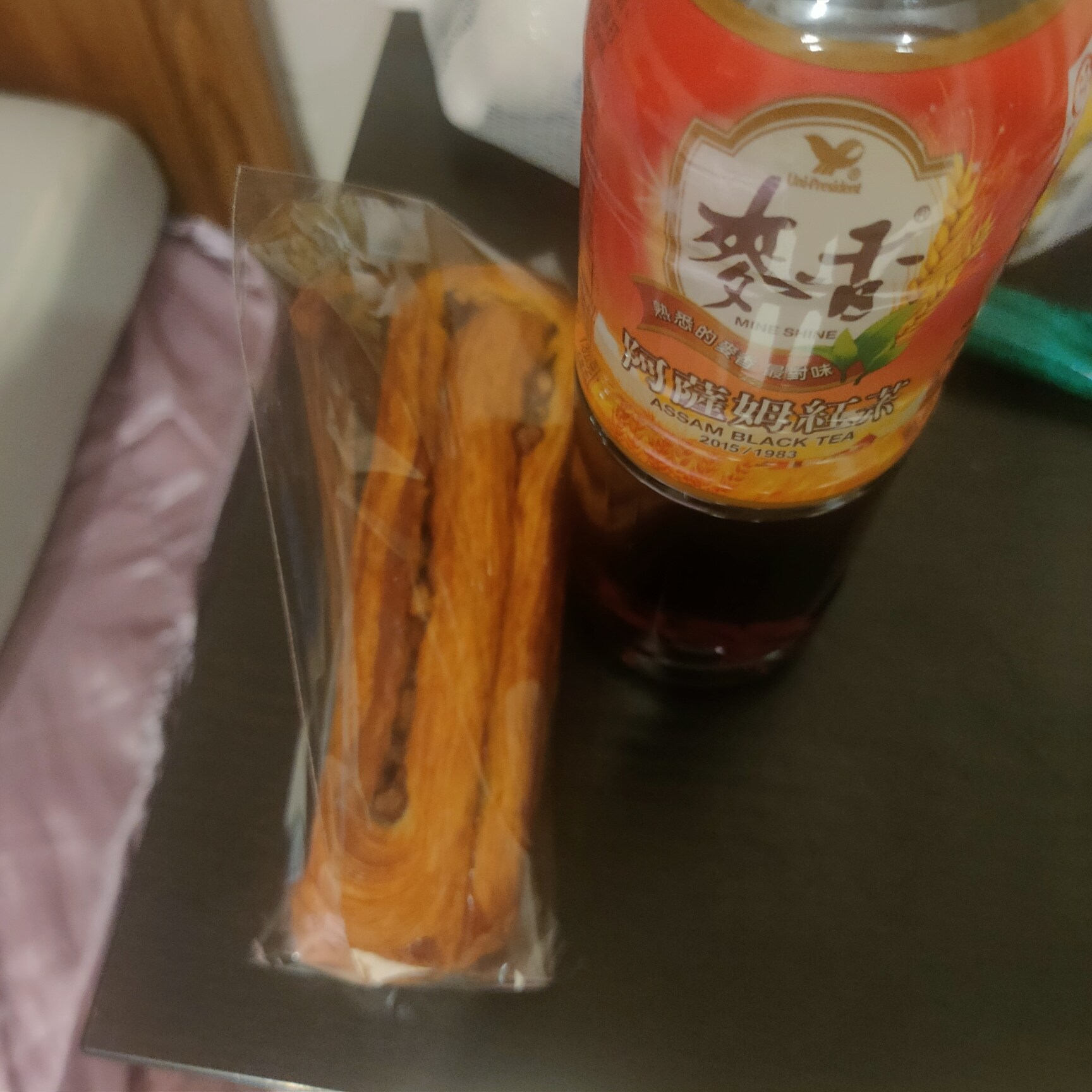 點心去全聯買的紅豆麵包和紅茶
