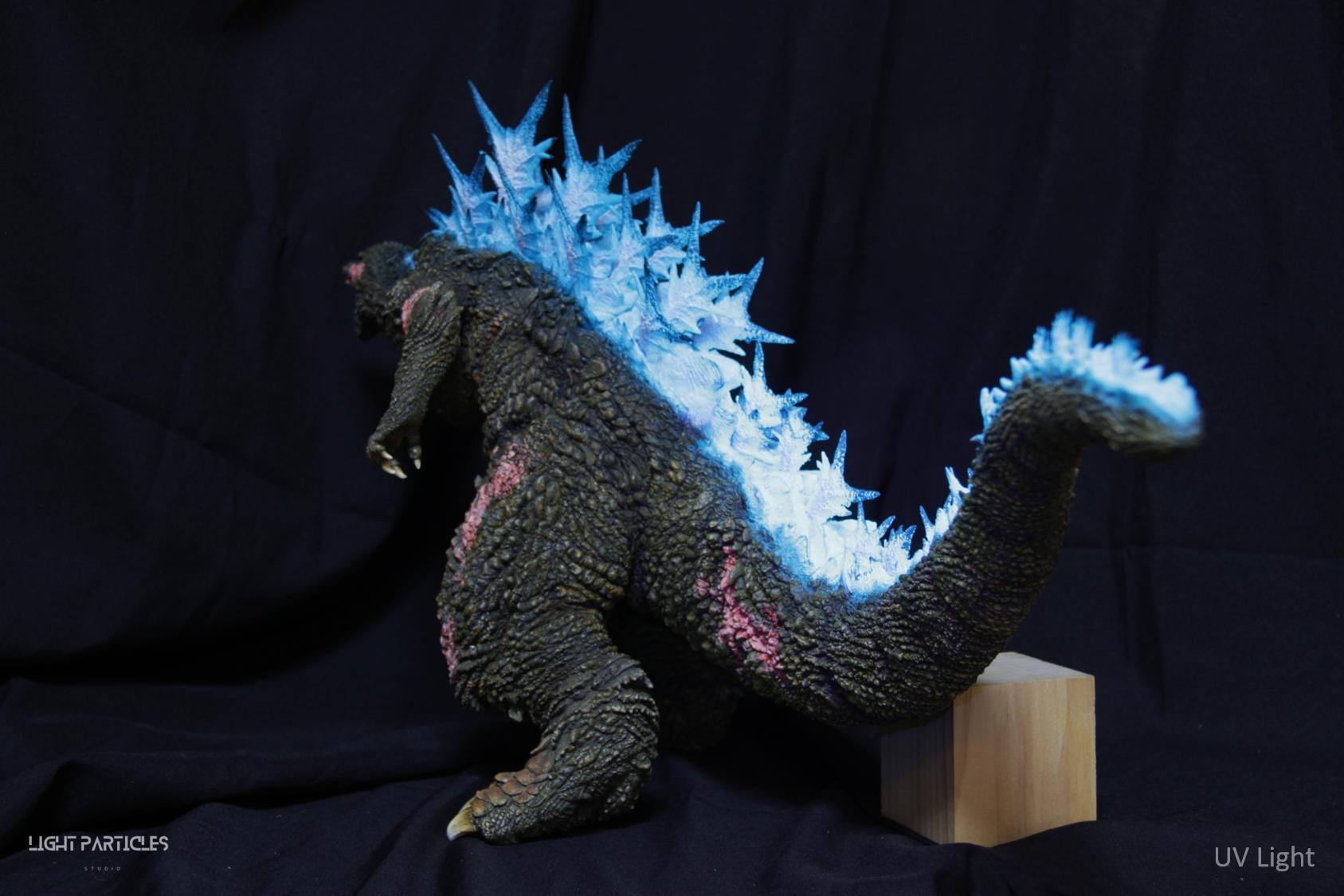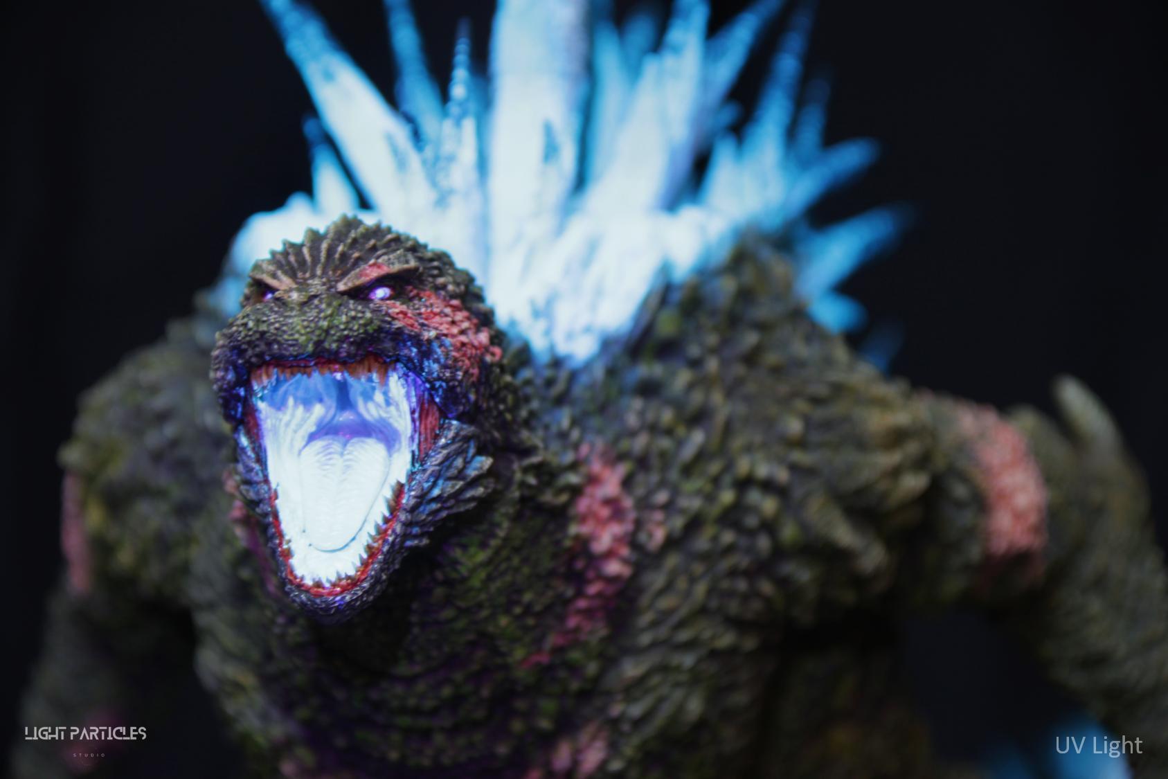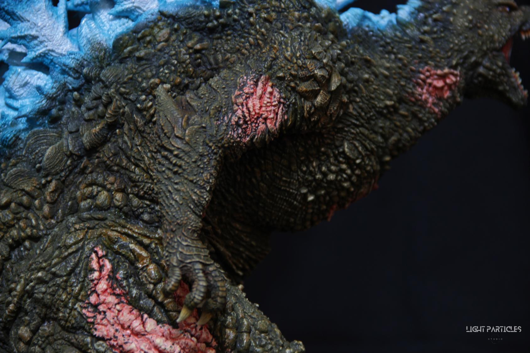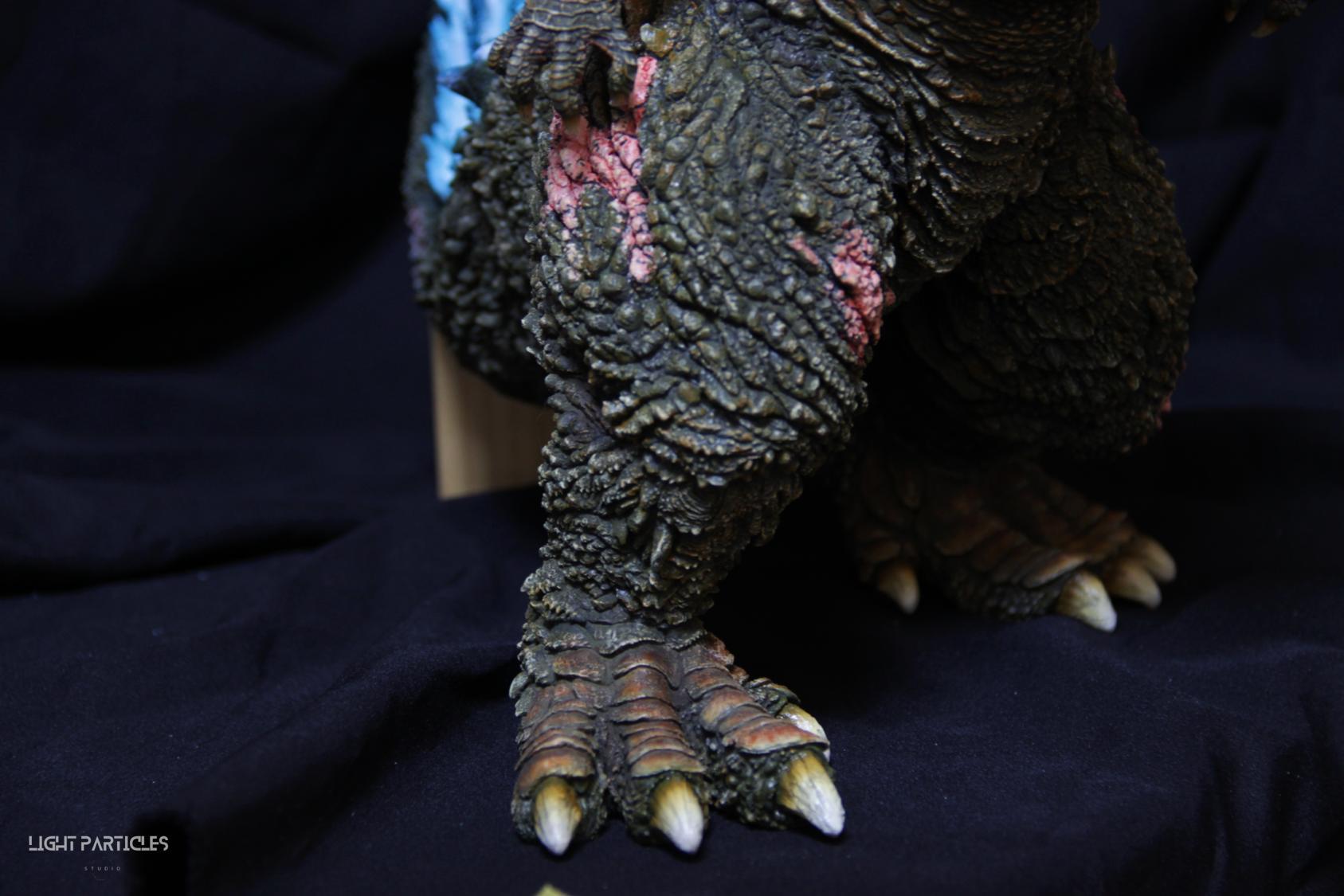 第二套委託,黑龍工房 哥吉拉2023銀座咆哮套件。需求大致分為幾點,藍眼,熱線嘴巴並帶有生物血肉感,塵土色指甲,海神作戰的背鰭顏色以及比較集中熱線範圍,還有增加身上傷痕區域。為了達到委託需求,背鰭呈現較上次製作調整作法與顏色來維持高光效果,嘴巴也把口腔內外做出不同的顏色,手繪傷痕並調整分布製造較隨機的效果。最後拍照增加UV燈效果呈現,讓熱線發光效果往上提升。即使第二次製作這組套件,還是對套件的品質與雕塑細節感到驚喜,真的很值得收藏。希望大家喜歡這次的呈現~