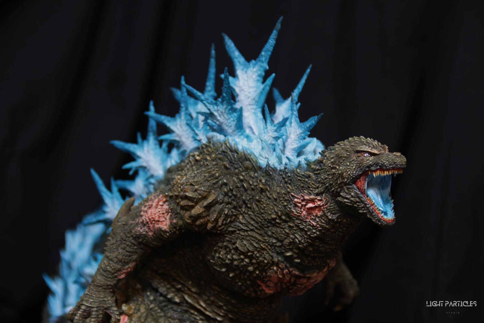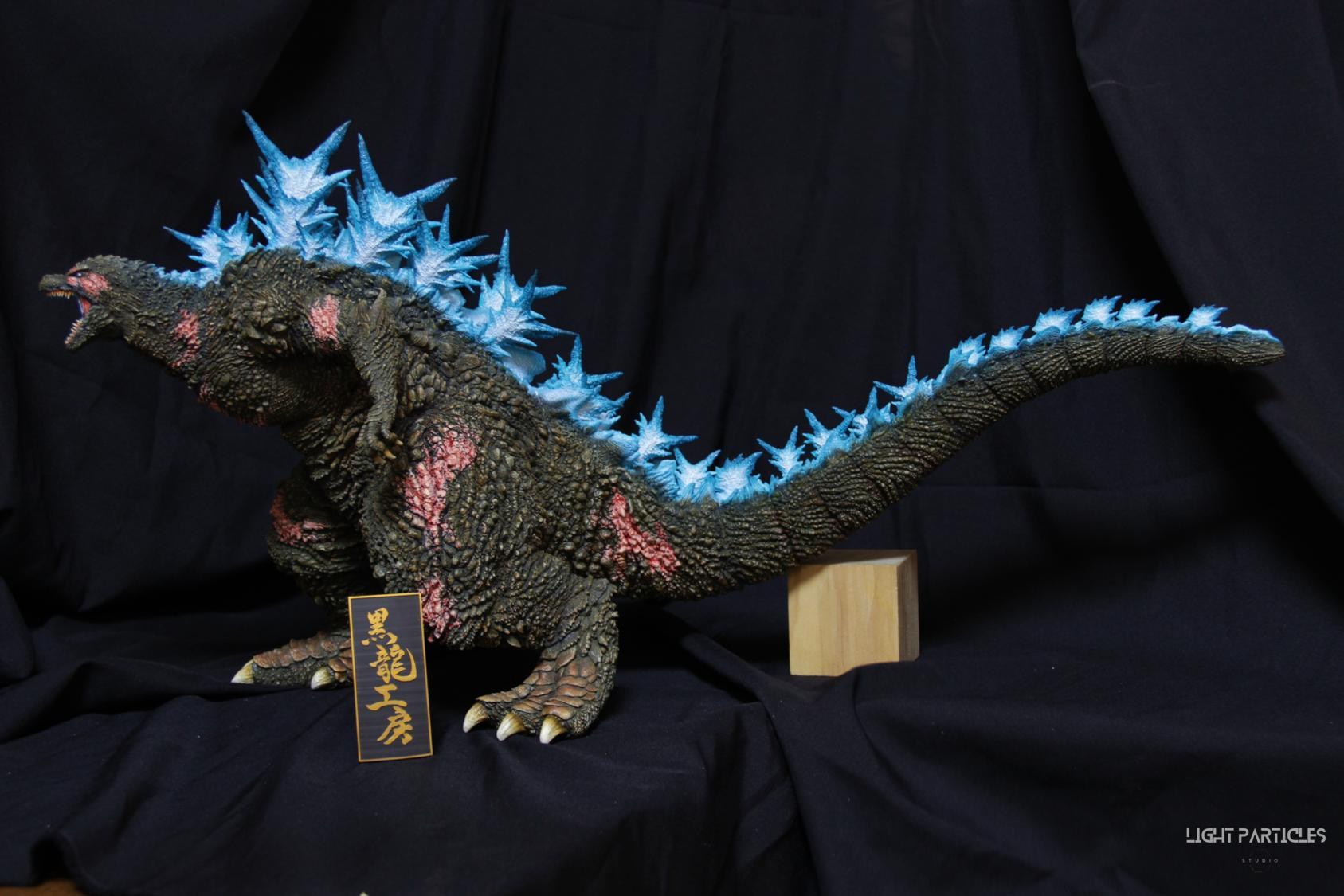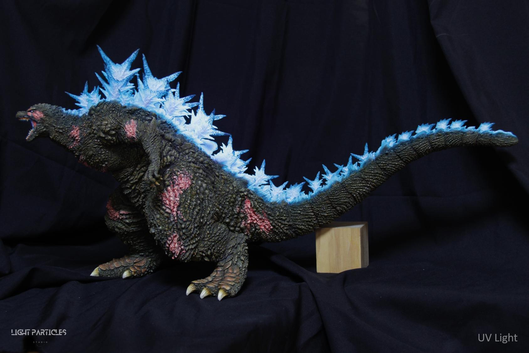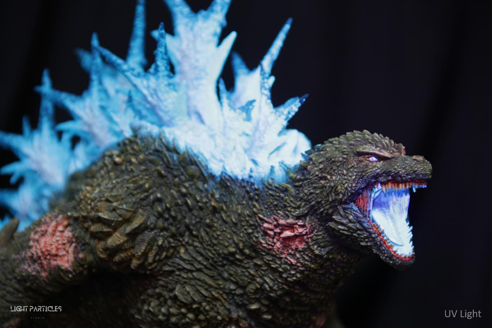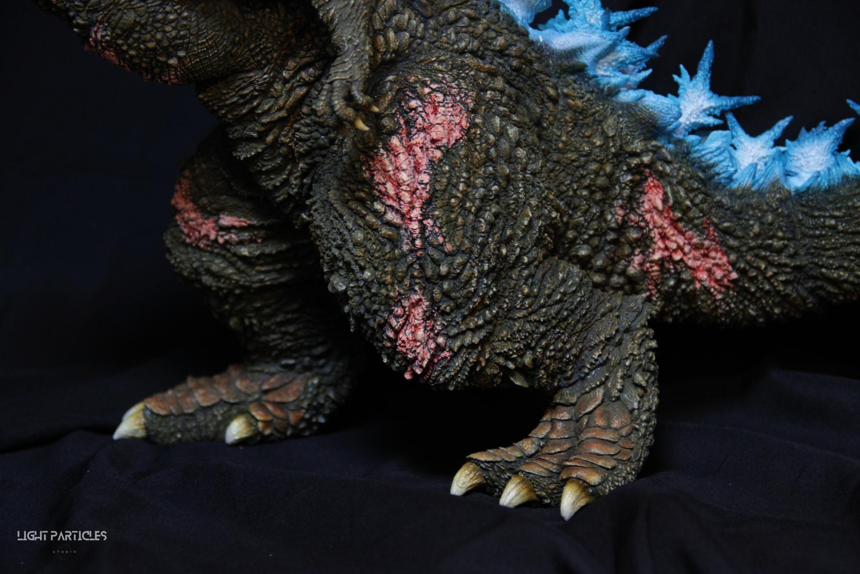第二套委託,黑龍工房 哥吉拉2023銀座咆哮套件。需求大致分為幾點,藍眼,熱線嘴巴並帶有生物血肉感,塵土色指甲,海神作戰的背鰭顏色以及比較集中熱線範圍,還有增加身上傷痕區域。為了達到委託需求,背鰭呈現較上次製作調整作法與顏色來維持高光效果,嘴巴也把口腔內外做出不同的顏色,手繪傷痕並調整分布製造較隨機的效果。最後拍照增加UV燈效果呈現,讓熱線發光效果往上提升。即使第二次製作這組套件,還是對套件的品質與雕塑細節感到驚喜,真的很值得收藏。希望大家喜歡這次的呈現~