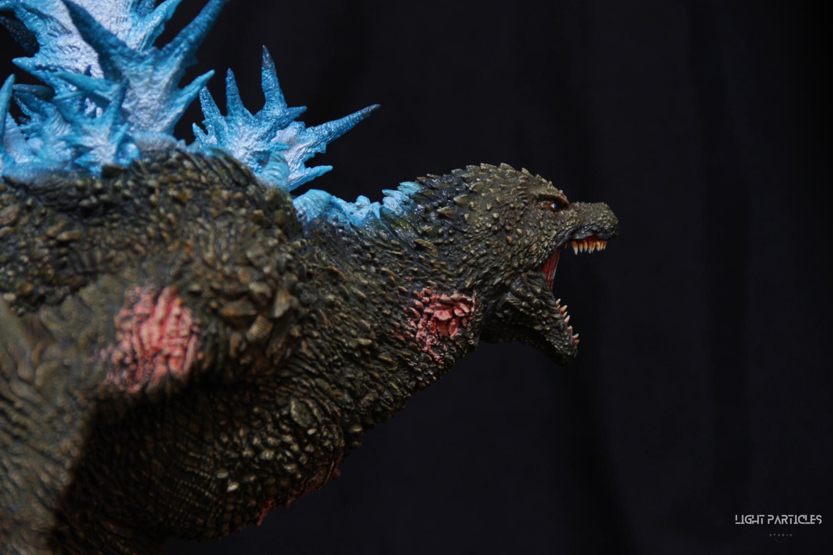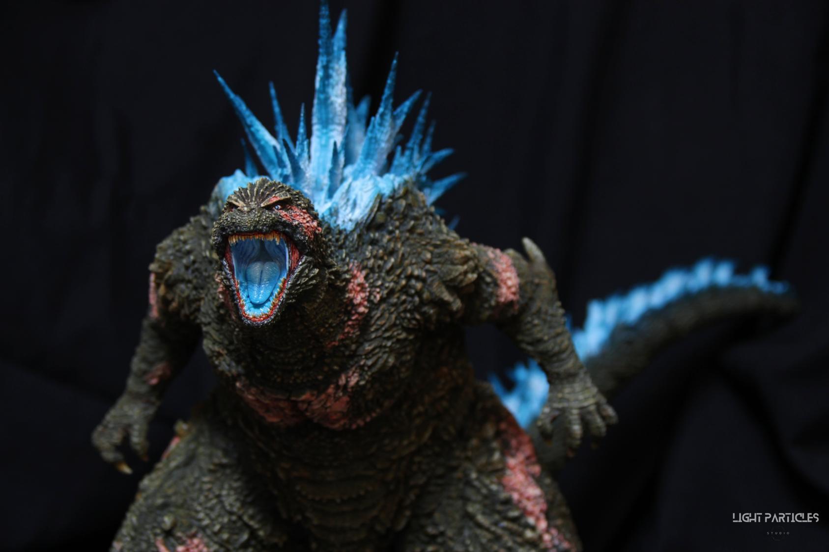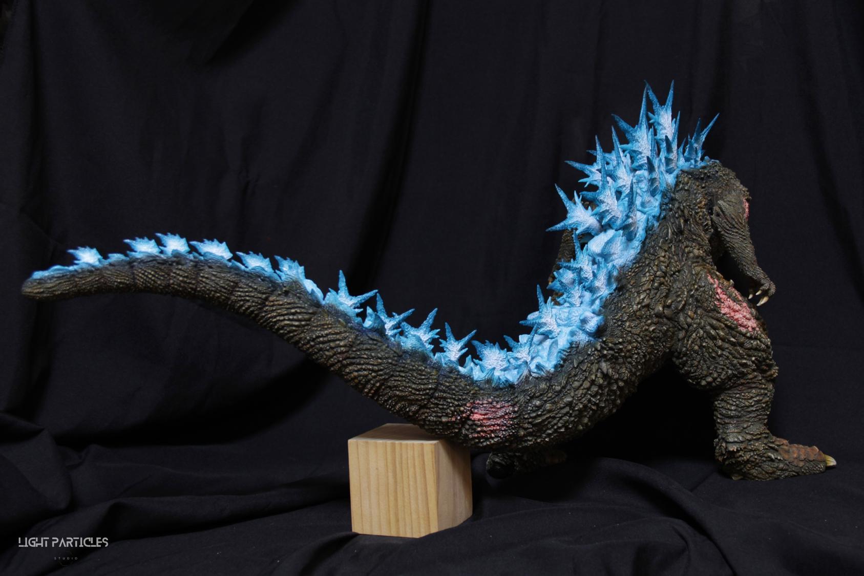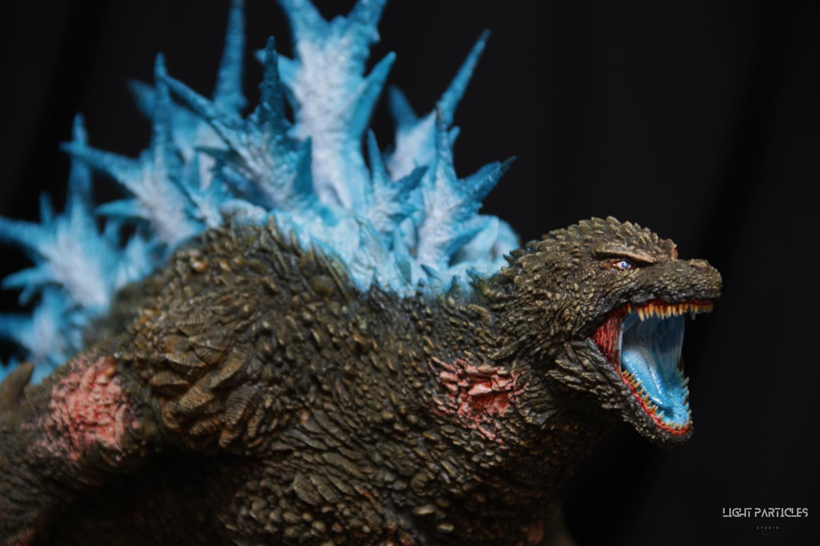 第二套委託,黑龍工房 哥吉拉2023銀座咆哮套件。需求大致分為幾點,藍眼,熱線嘴巴並帶有生物血肉感,塵土色指甲,海神作戰的背鰭顏色以及比較集中熱線範圍,還有增加身上傷痕區域。為了達到委託需求,背鰭呈現較上次製作調整作法與顏色來維持高光效果,嘴巴也把口腔內外做出不同的顏色,手繪傷痕並調整分布製造較隨機的效果。最後拍照增加UV燈效果呈現,讓熱線發光效果往上提升。即使第二次製作這組套件,還是對套件的品質與雕塑細節感到驚喜,真的很值得收藏。希望大家喜歡這次的呈現~