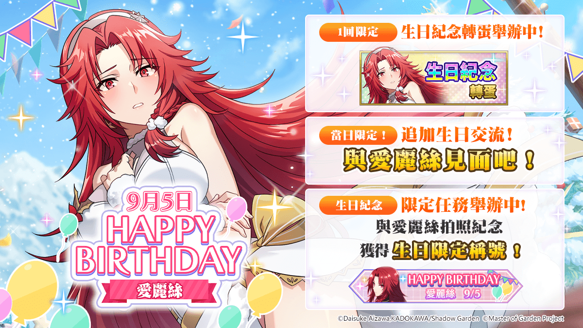 即將在 9 月 5 日為「愛麗絲」的生日,為此紀念於遊戲內實施一系列生或活動,包含舉辦 生日特別轉蛋、當日限定生日特別對話、生日紀念限定任務。
