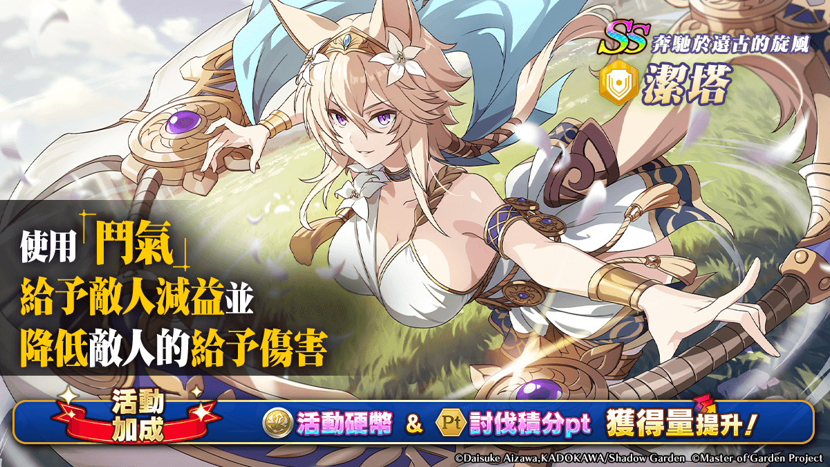 配合外典『向陰影凋零的鎮魂歌』第 5 章開幕,自 4 日(四)13 時(JST)推出的期間限定轉蛋角色【奔馳於遠古的旋風】潔塔,是名使用「鬥氣」給予敵人減益並降低敵人給予傷害的黃屬性坦克角色,搭配專用魔道具「葉冠圓刃」。