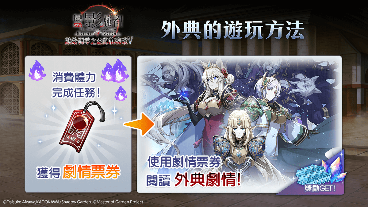 自 9 月 4 日起正式推出外典『向陰影凋零的鎮魂歌』第 5 章,透過消耗體力完成任務獲得劇情票卷即可閱讀外典劇情。