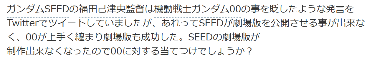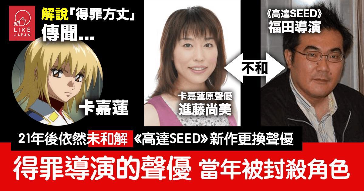 SEED-DESTINY的場外八卦也是非常有名的,比如說最知名的福田跟進藤尚美和鈴村健一不合,兩人後續在戲中的戲份跟變化肉眼可見的人為痕跡、老公鈴村健一(真飛鳥)就不說,卡佳里本身也從SEED時期的剛毅到DESTINY初期的迷惘,最後直接變成哭哭啼啼和精神象徵,後續甚至連戲份跟配音都沒了,到了最新的劇場版還直接更換聲優,一整個此地無銀三百兩。其他像是製作費疑雲、跟工作人員不合等等,都讓DESTINY的風波至今難以平息。