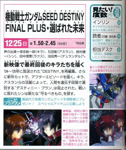 現在觀眾應該很難想像,以前50話一季是基本,然後應該更難想像50話都無法把故事講完,DESTINY就是如此。然後你可能會以為他是不是想講的東西太多? 沒有完全沒有,奇葩的福田甚至還有餘裕塞2話總集篇、半話拿來打歌(米雅)。結果講了一個低年齡層的二分法打倒大魔王故事也就算了,戰鬥上各種兼用卡看了也不過癮,然後直到50話劇情一路暴走讓觀眾都看不下去,不得不緊急弄出FINAL PLUS來收尾,但FINAL PLUS裡面又搞事了,首先是拉克絲上位加上煌的身分引人側目之外,劇尾真飛鳥居然痛哭流涕跟煌握手,一種我認輸了我投降的感受,別說飛鳥派看不下去,筆者當年AA派都覺得福田夫婦到底在演甚麼自爽神劇,含SEED花了100話以上的篇幅,卻講了一個不知想表達甚麼的自爽故事,真的是奇葩。