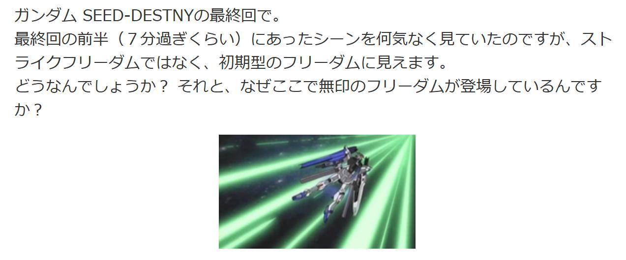 現在的觀眾跟年輕人只能看到DVD/HD REMASTER版可能難以體會,但當年的TV版的作畫失誤真的是用罄竹難書來形容都算客氣了。有多誇張呢? 首先你有看過一個動畫連話數都會打錯的嗎? DESTINY做到了,再來愛用兼用卡不是問題,但你用到連機體都搞錯是不是太離譜了點? 感應炮閃一閃就從攻擊自由變自由、光束劍把小兵劈成兩半瞬間變成別的機體、上一秒剛被光束槍射爆的夾艙下一秒瞬間長回來,跟這些大老相比之下真飛鳥在湖邊為史黛拉哀悼的時候嘴巴活像進擊的巨人都是小事了。