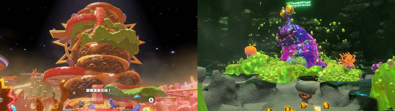 來到這座像遊樂園的食品加工廠層,參觀攪拌鞦韆、汽水池子、油炸薯條與起士刨絲的現場,並協助恢復漢堡的堆疊生產,途中有很多感染病菌的地方,要拿鹽巴除箘;亂源則來自一條大鼻涕蟲 Boss,請他吃鹽巴XD。令人驚艷,充滿創意與趣味的主題關卡。老任除了黏稠的噴墨、清澈的水,熱油也是做的滋滋作響。