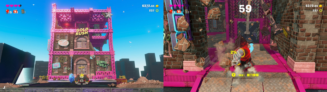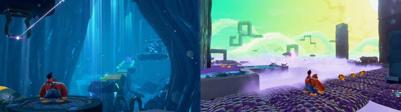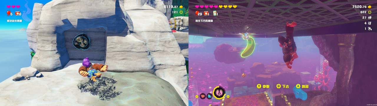 本作的探索感來自跑圖時恣意妄為的破壞,並在到處打、到處挖的過程中,發現新的道路場所、香蕉化石、遺跡挑戰;破壞的爽快感與關卡的探索感相結合,是一個很有趣的遊玩流程。