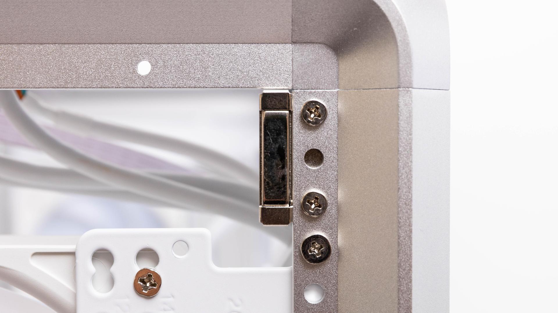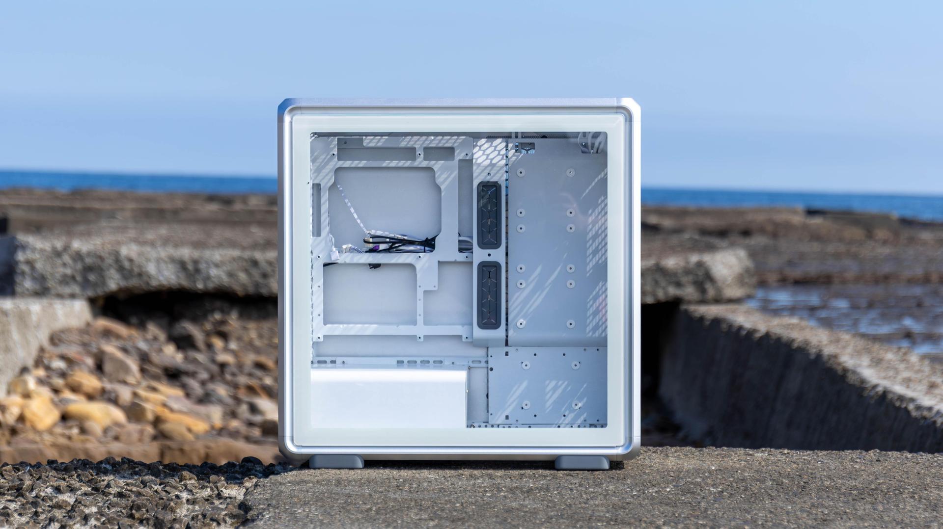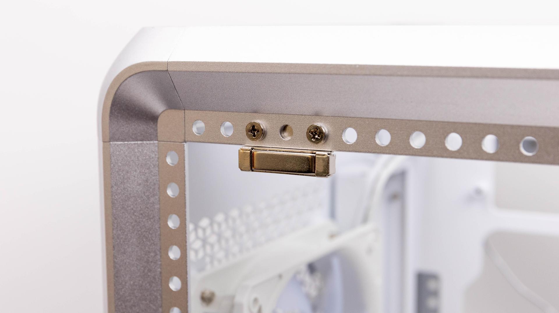 側面為岡樺透側玻璃,玻璃邊框有做白邊設計,可以直接看到機殼內部全景,內層也是全白色設計,背面為鋁製背板,左邊有網孔設計,可以有效進氣或排出熱氣。