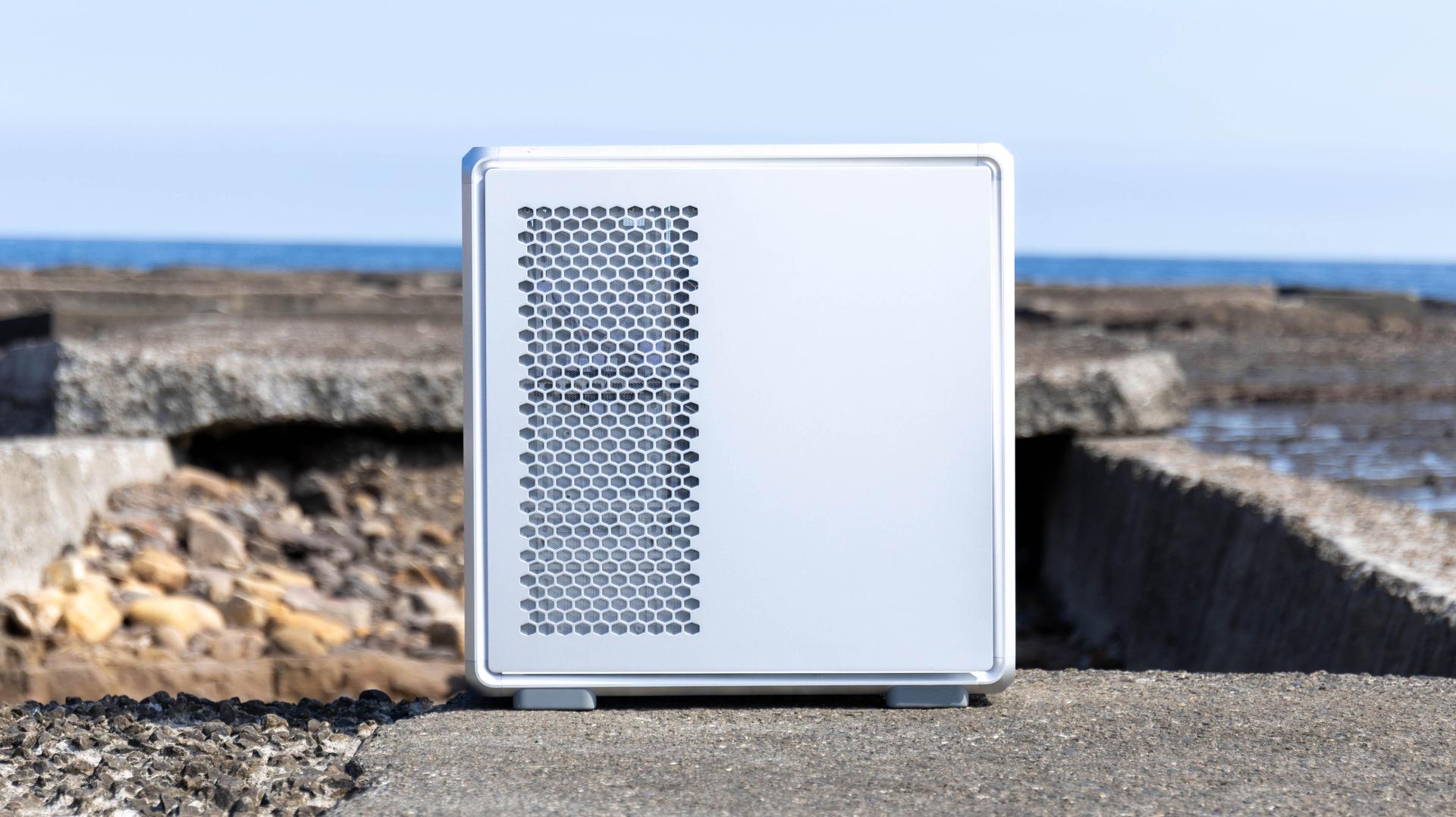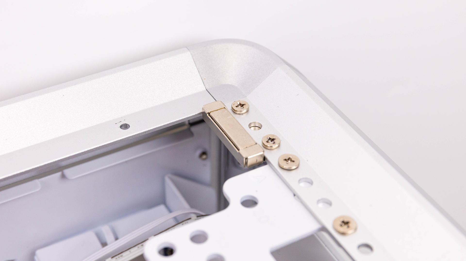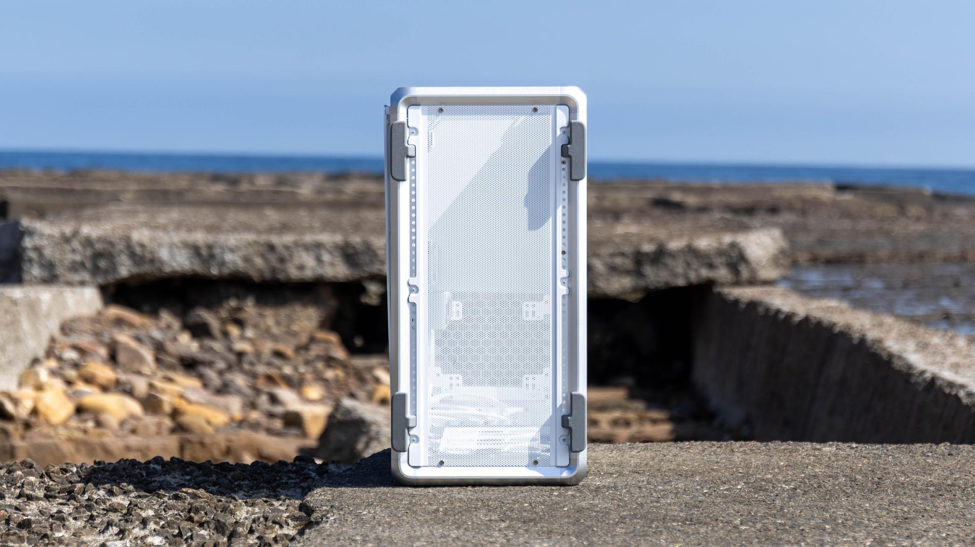 側面為岡樺透側玻璃,玻璃邊框有做白邊設計,可以直接看到機殼內部全景,內層也是全白色設計,背面為鋁製背板,左邊有網孔設計,可以有效進氣或排出熱氣。