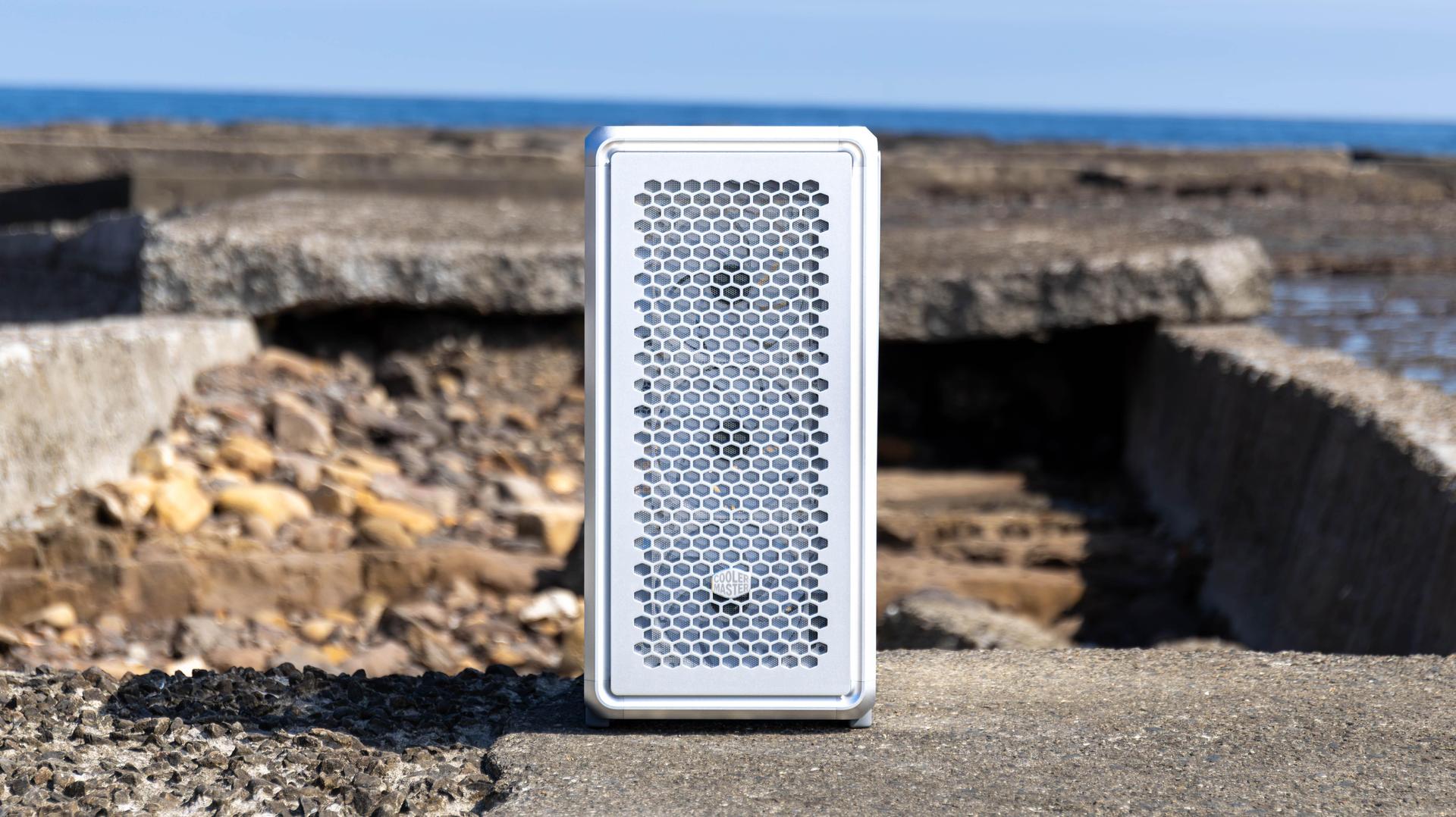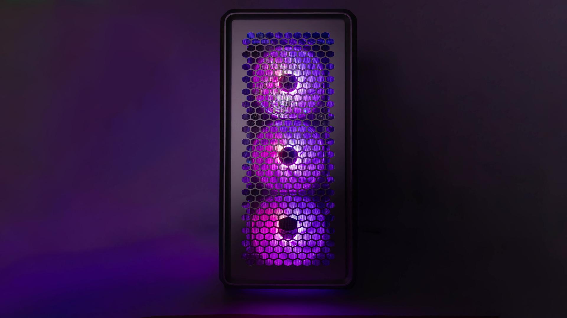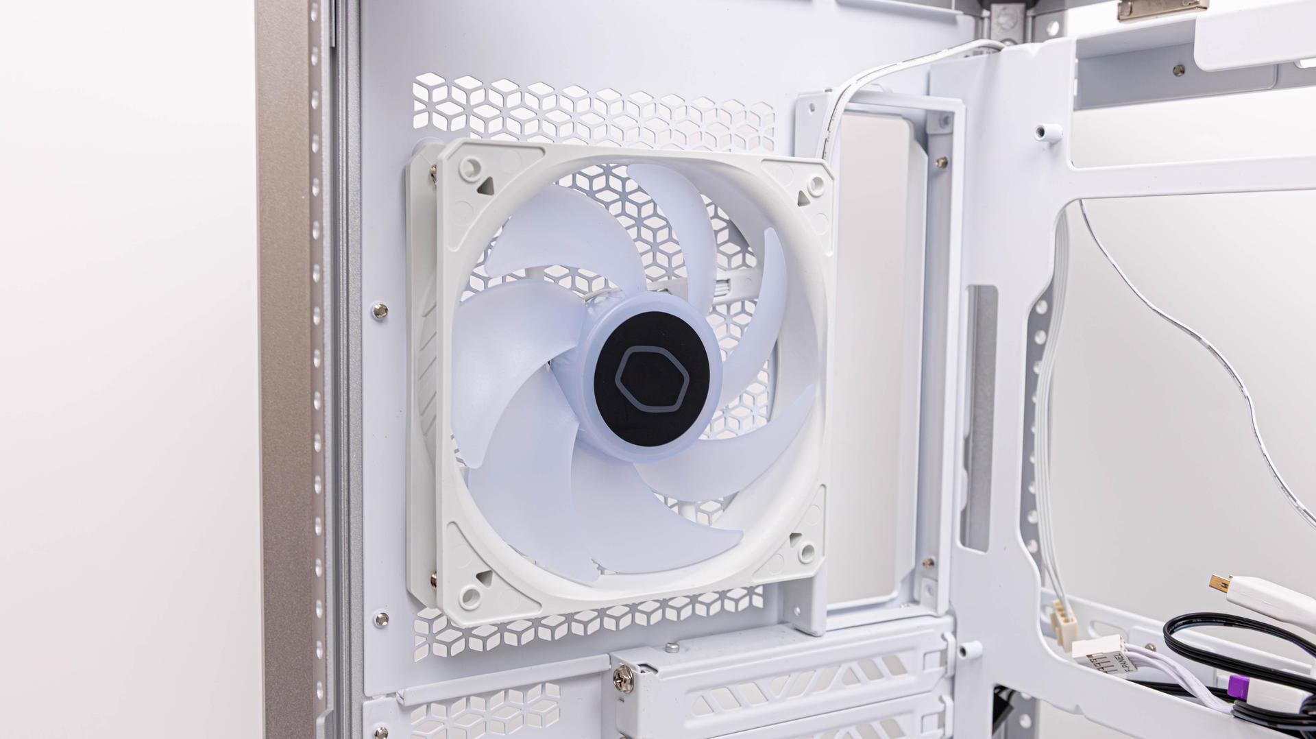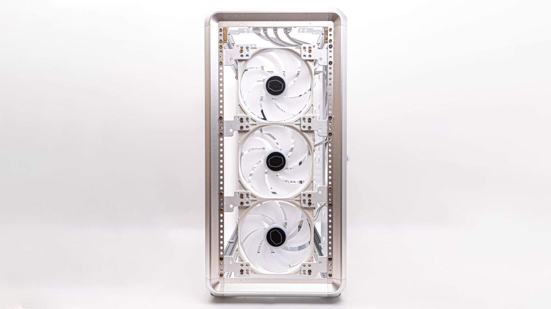 MasterFrame 600 正面是鋁製網孔面板,配置三顆 SF140 ARGB 風扇,外層是孔洞設計,內層有一片金屬濾網,下方酷碼標誌是可以自由調整位置,巴友可以調整自己喜歡的位置擺放,背面則是鋼材設計,配置一顆酷碼 SF120 ARGB 風扇。