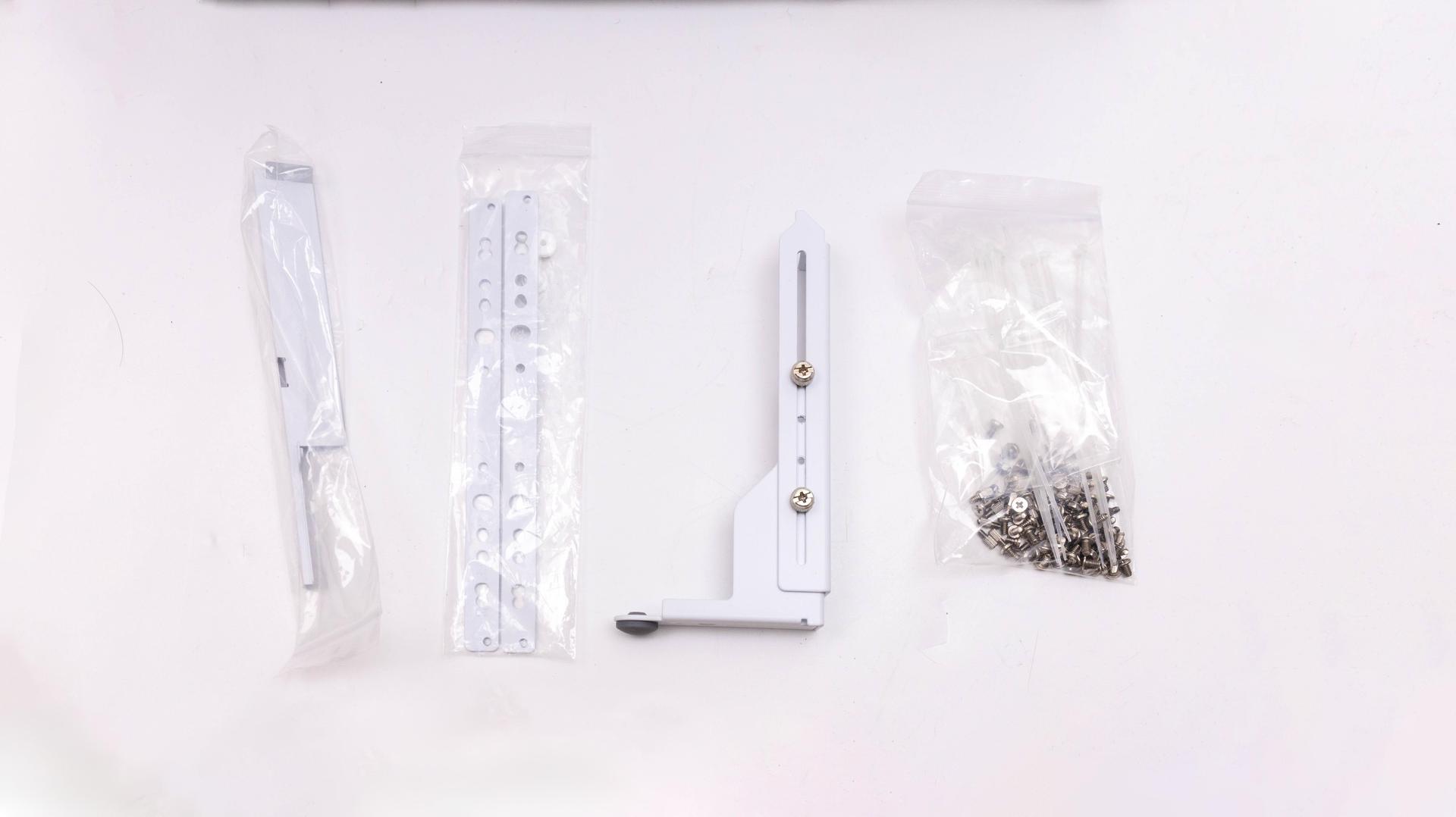MasterFrame 600 配件,左邊開始首先是機殼倒置時需使用的 PSU 支架、風扇/SSD/HDD 支架、顯示卡支架、螺絲/束帶