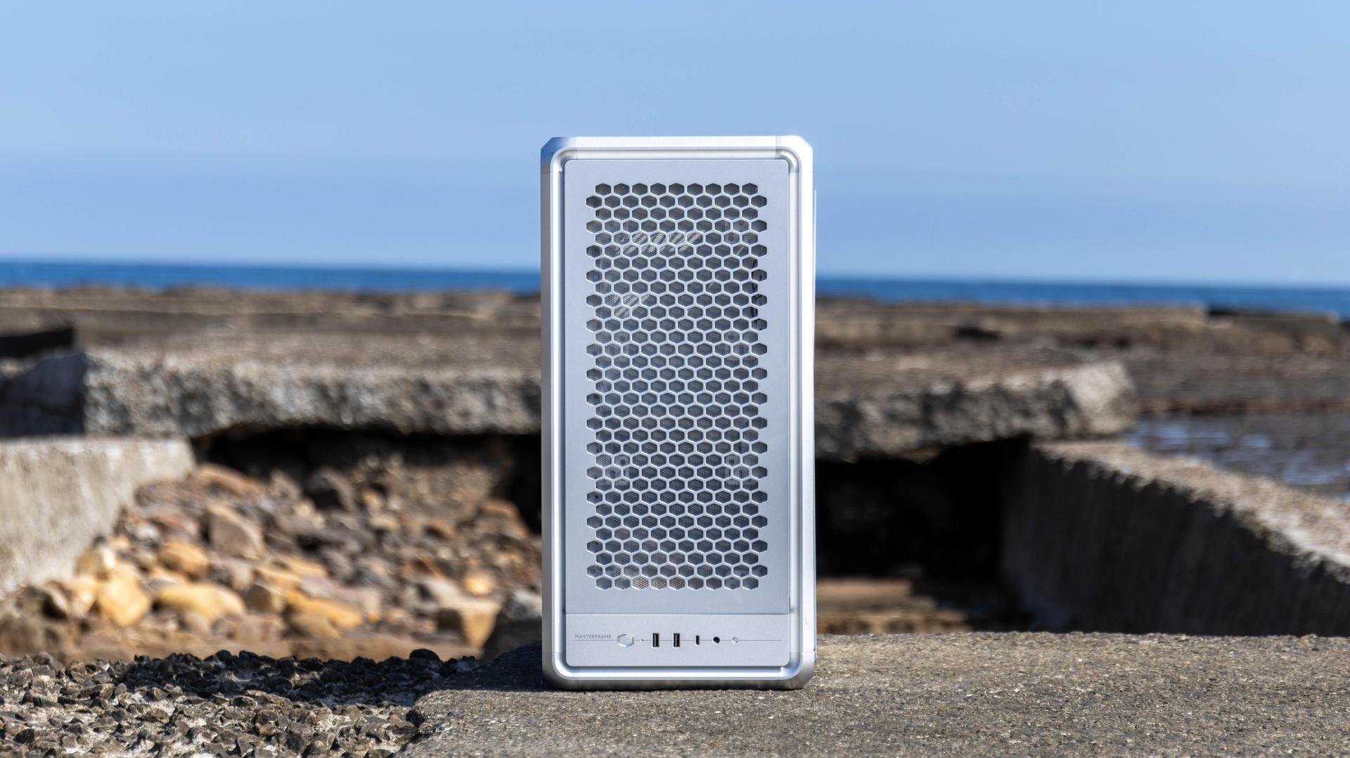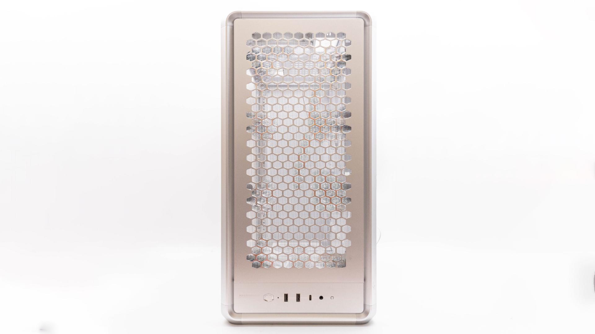 2 個 USB-A 、1 個 USB-C、開機鍵、重啟鍵、3.5mm 音源孔,左邊還有 MASTERFRAME 字樣,底部則是整片透氣網孔設計,並配置一片磁吸濾網,可以有效阻擋灰塵並保有優異散熱。