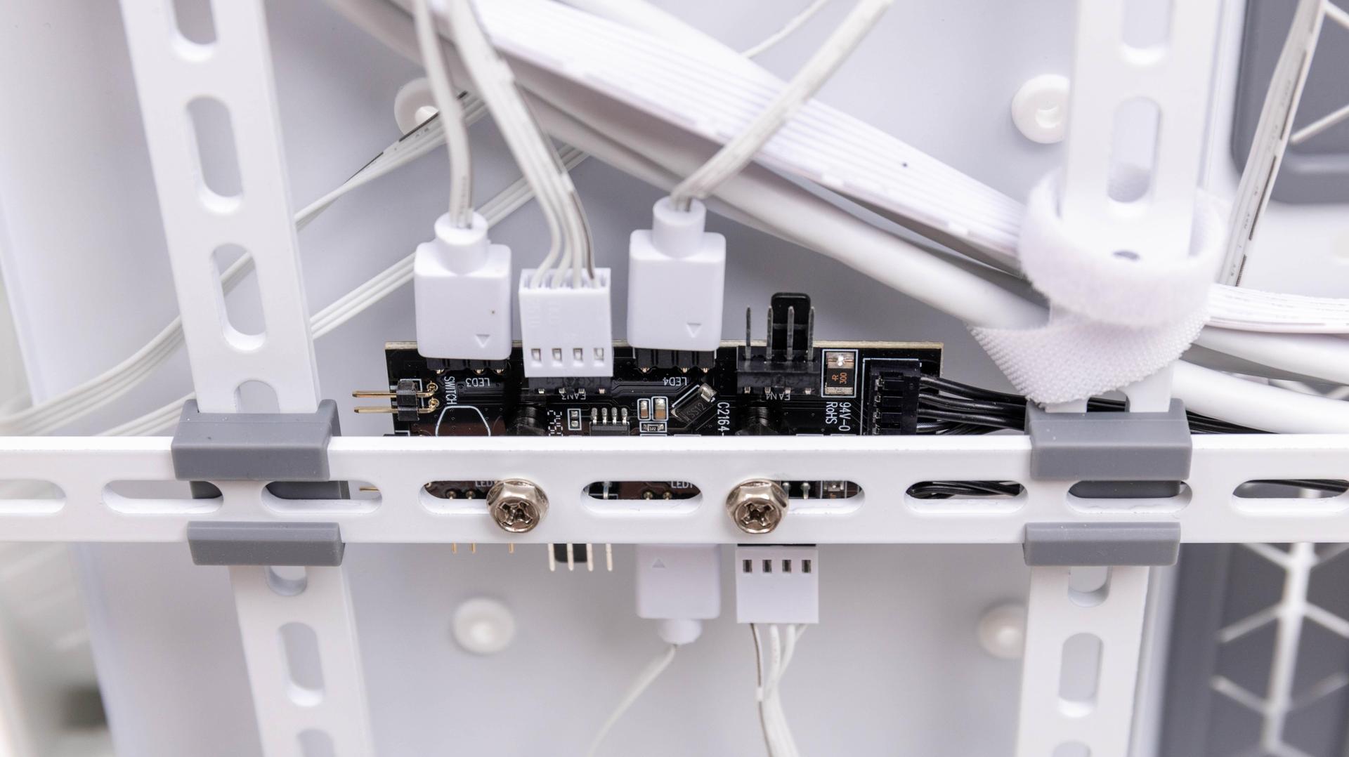 MasterFrame 600 配置一組風扇/ARGB 集線器,前方 3 顆風扇也都預裝好,需要接上 SATA 電源才能做動,所以安裝電供時也要記得接上 SATA 電源線。