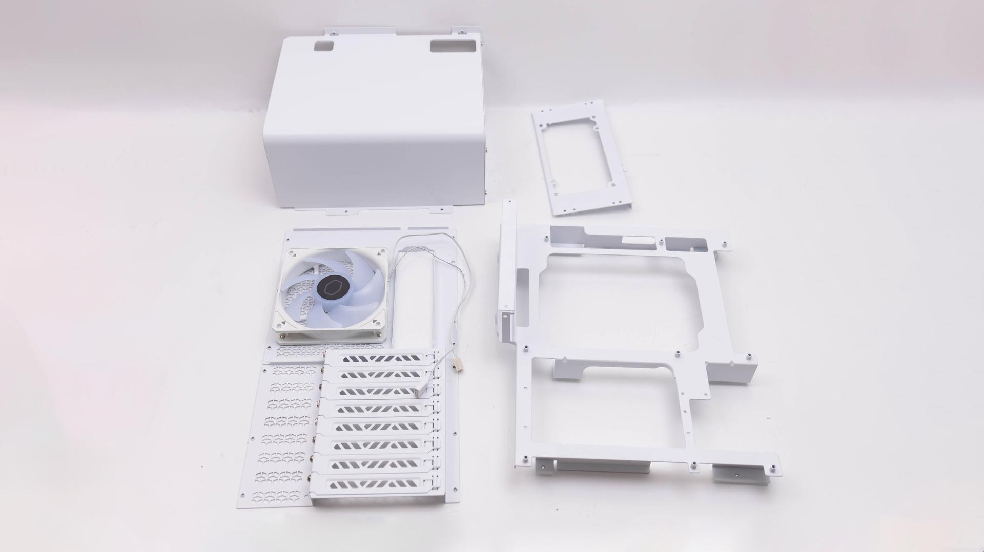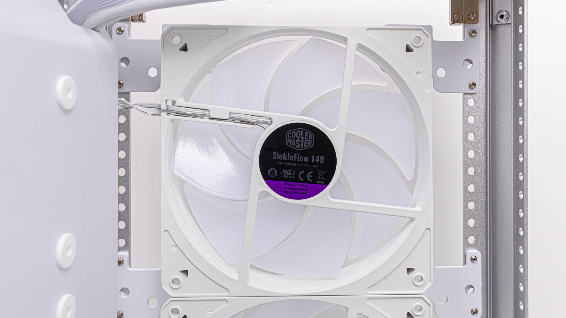 MasterFrame 600 拆卸後,前方預裝 3 顆 SickleFlow 140 ARGB 風扇,後方則預裝 120 版本 1 顆,前方風扇支架還可以安裝 120、200 規格風扇,風扇支架也可以自由拆卸,用不到就拿掉,沒問題的。