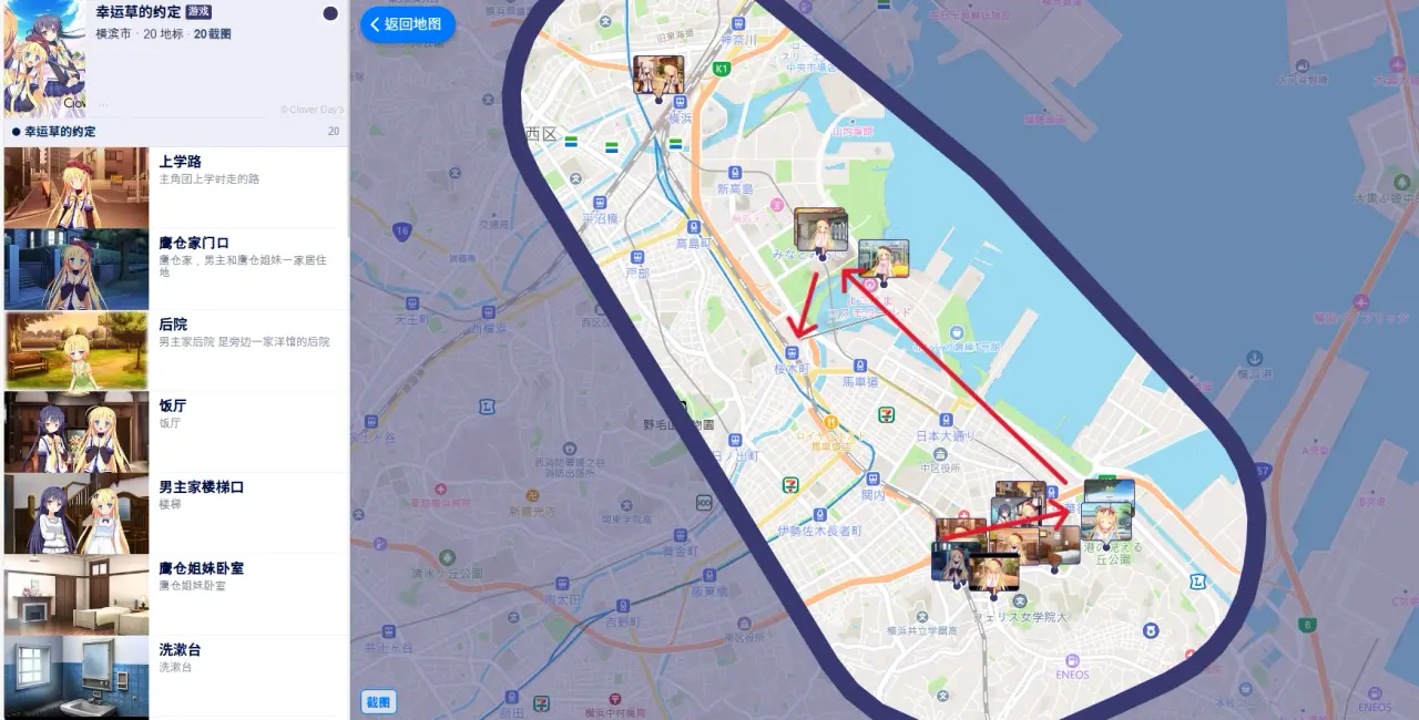 原先是因為另一部作品白日夢的構想圖中case 1的主要地點發生在橫濱,既然都到橫濱就看看還有哪部作品能巡禮,於是就在去日本前把Clover Day's跑完