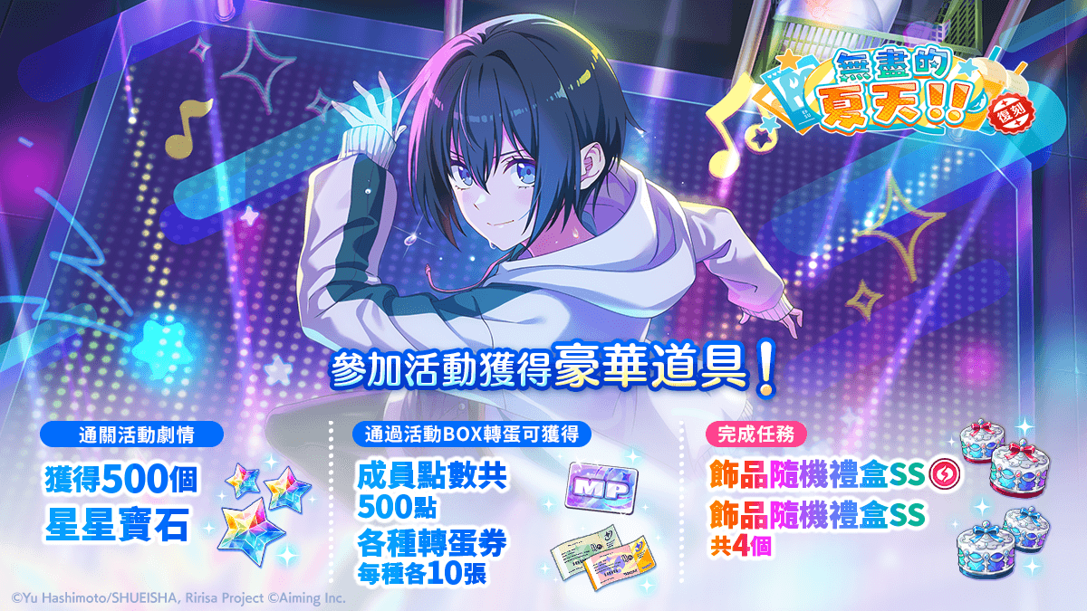 於本次期間限定復刻活動「無盡的夏天!!」當中追加挑戰任務,只有活動 BOX 轉蛋更新 7 次就可獲得【耀眼笑容】亞理亞 x1,活動登入獎勵還可獲得總共10張高級轉蛋券。