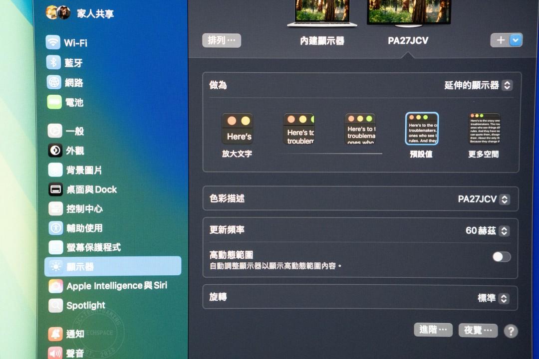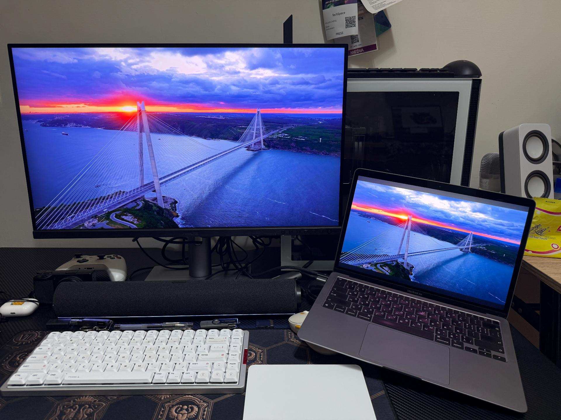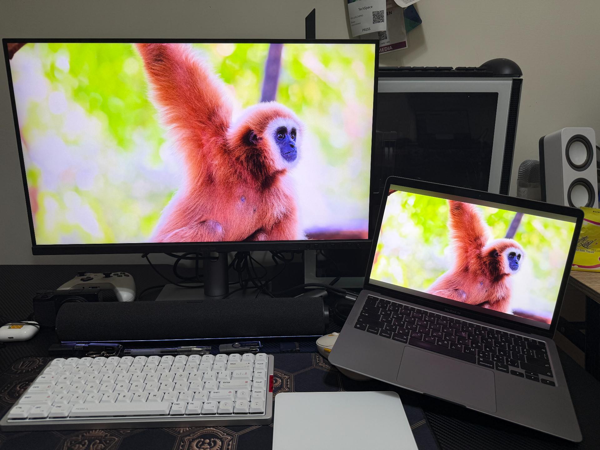簡單翻拍幾個與 M1 Macbook Air 筆電螢幕的畫面對比給大家作為參考,以肉眼實際觀看的話,兩者之間的差異算是相當小了,要拿來當作與 Mac 顯示器之間多裝置切換使用的話是 ok 的。