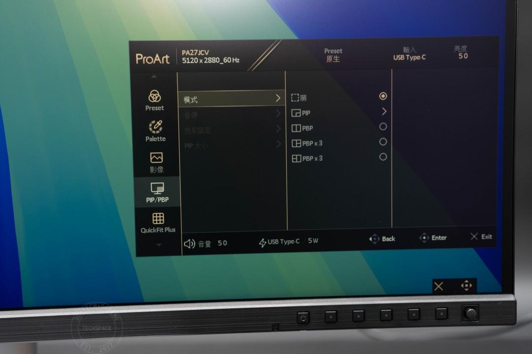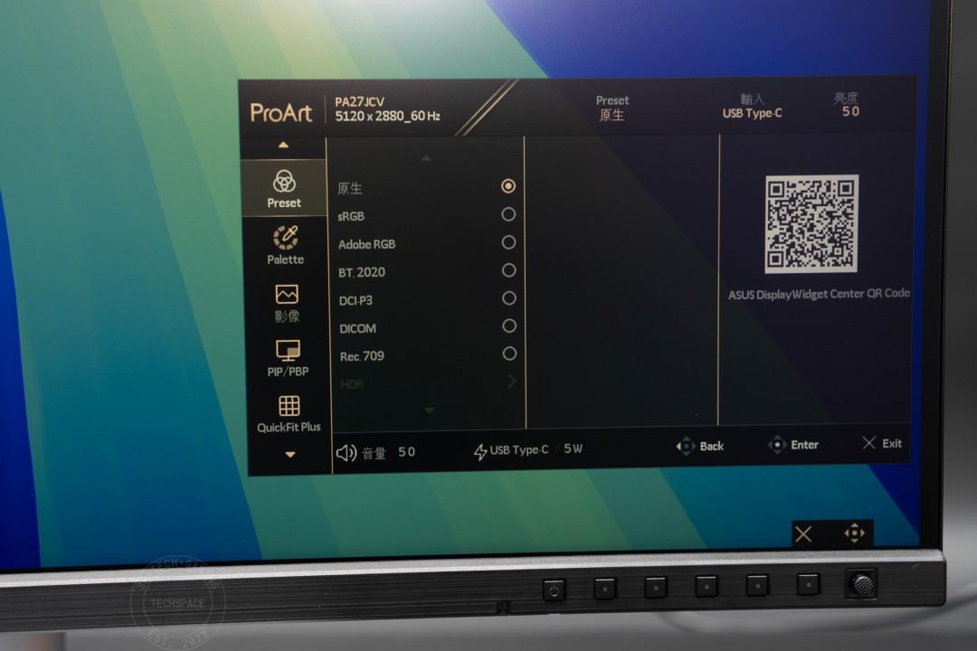 OSD 五向搖桿部分提供常見的 Preset、Palette 細部調整、影像、PIP / PBP、QuickFit Plus、系統設定等功能,其中在 Preset 部分預設為「原生」模式,另外也提供 sRGB、Adobe RGB、BT. 2020、DCI P3、DICOM、Rec 709 等模式可切換。
