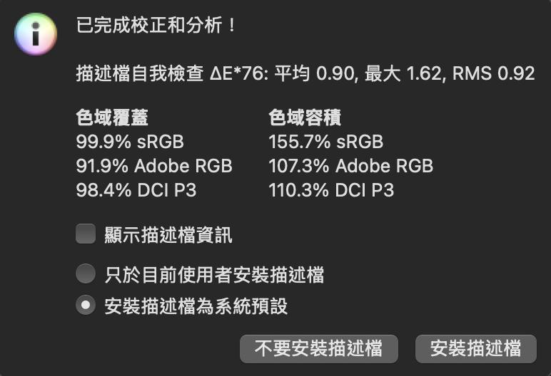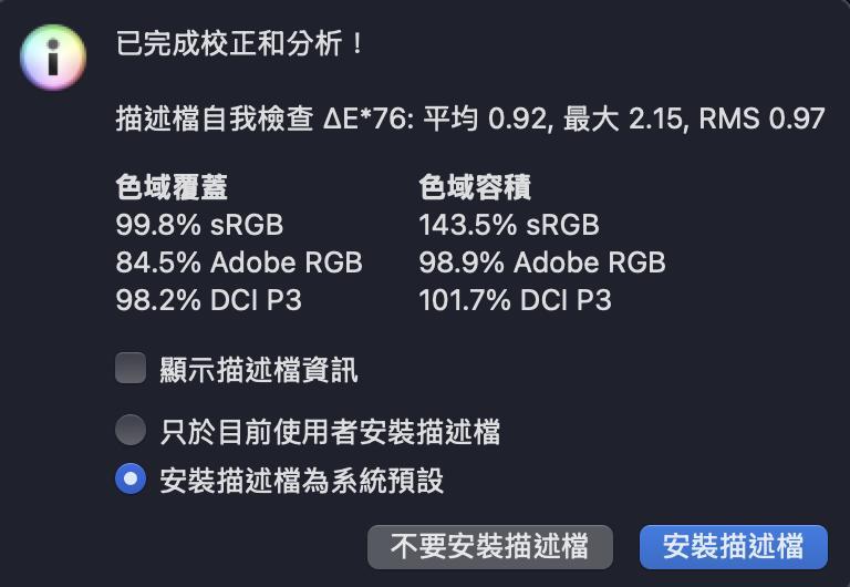 雖然 Adobe RGB 的色域涵蓋範圍稍微小了點,但整體仍有 99.8% sRGB 和 98.2% DCI-P3 的覆蓋範圍,同時 ΔE*76 為 0.92,色彩準度還是相當不錯。