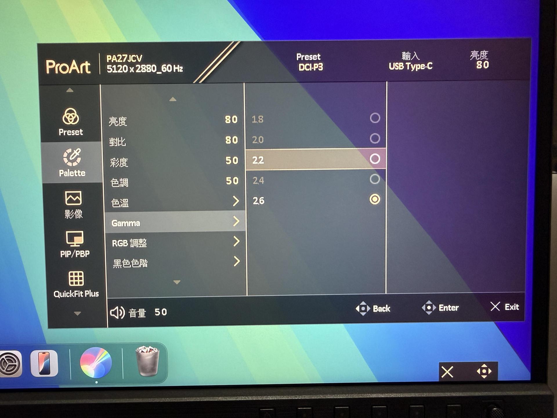 值得注意的是,小編會建議切換至 M-Model 色溫後,也同步將 Gamma 值從原先的 2.2 切換至 2.6,視覺上會更接近 Mac 顯示器的色彩表現。