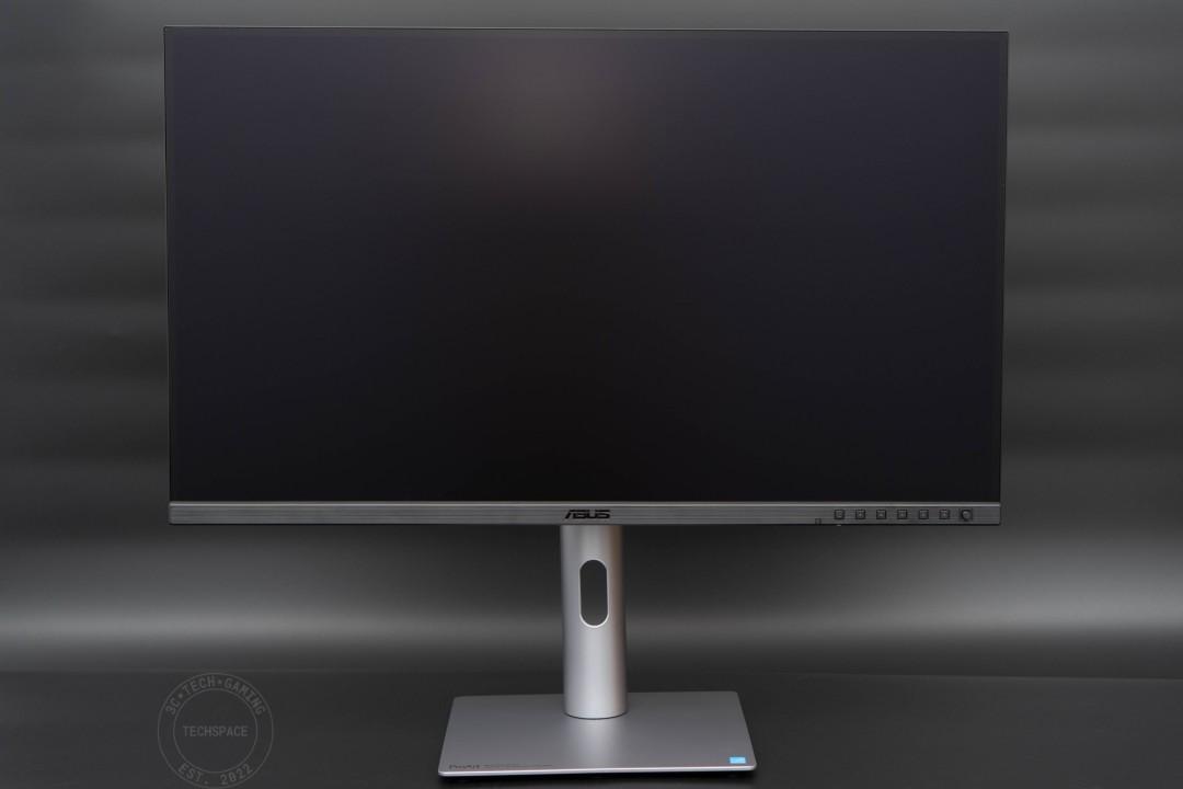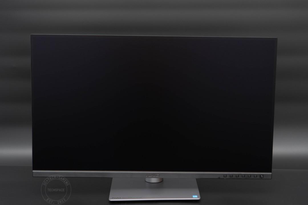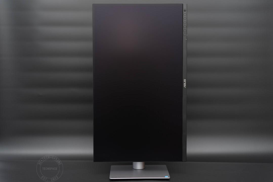 正面顯示器搭載 27 吋 IPS 面板,採用窄邊框設計,主要控制區集中在正面右下方,下排中央有 ASUS LOGO。