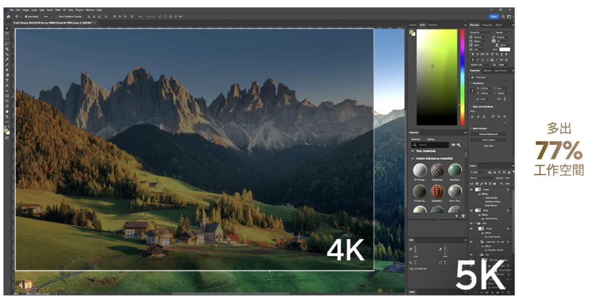 5K 解析度帶來的另一大好處就是可操作的工作空間會更多,以同樣是 27 吋的顯示器大小來說,PA27CJV 會比 4K 解析度提升約 77% 的畫面空間,可進一步增加日常使用的彈性。另外,一般 27 吋 4K 解析度顯示器的 PPI 為 163,5K 解析度後 PPI 會有明顯提升,畫面精細度會清晰許多。