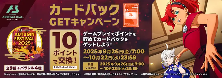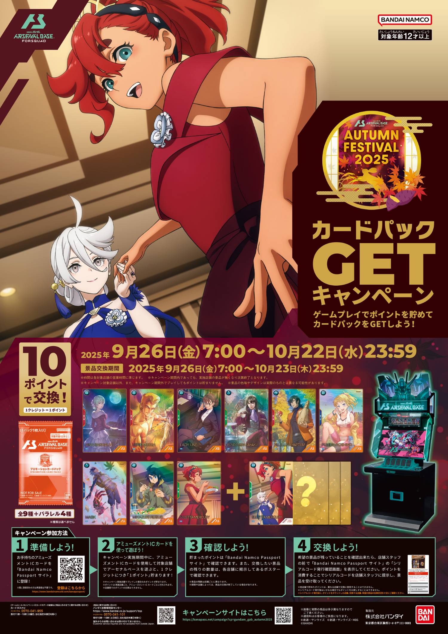 「Bandai Namco Passport」網站登入自己的Amusement IC卡(萬代南夢宮集團所發行的旗下遊戲帳號卡片),並且於指定店鋪遊玩《機動戰士鋼彈 ARSENAL BASE FORSQUAD》機台,每100日円就可以累積1點,每10點就可以於店家兌換「Autumn Festival 2025 推廣卡包GET活動」的卡包。