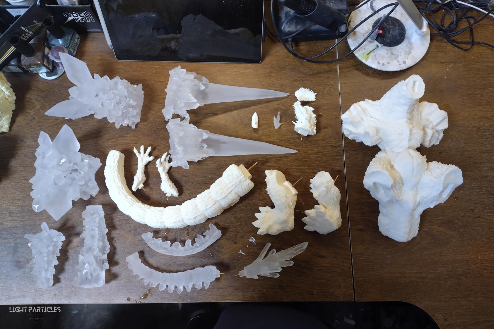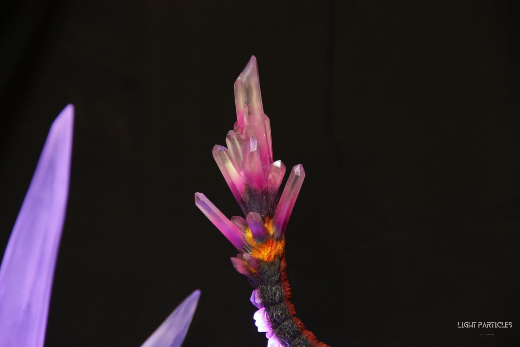 委託需求,電影預設深藍膚色,粉色水晶體,火炎能量紋路,RGB燈光效果搭配手機藍芽控制。透明件上色採用半透明漆與透明漆來平衡發光與不發光的狀態。身上指甲與水晶體皆為礦石的質感,爪子與牙齒皆為粉紅至粉紫漸層塗裝並帶有珠光色彩。肩膀與尾巴製作火炎塗裝製造出能量往水晶注入身體的發光感。膚色以電影為參考,增加顏色漸層並強調寫實感。雖然製作過程因為大量翻模瑕疵造成製作周期拉長不少,但整體效果非常吸睛,希望大家喜歡~
