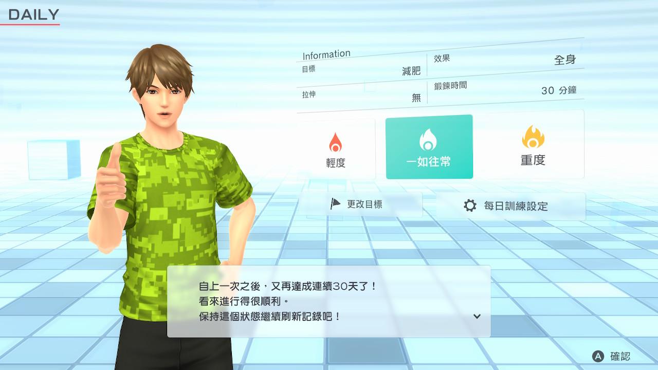 此外,「每日訓練」當中,多了三個選項「重度」「一如往常」「輕度」,這個設計很方便。就算你平常目標是30分鐘的玩家,如果當天覺得身體狀況不錯,就可以選重度增加難度跟時間;如果覺得當天身體狀況不佳,就可以選輕度降低難度跟運動時間。這對玩家來講很方便,可以視身體狀況調整訓練度。