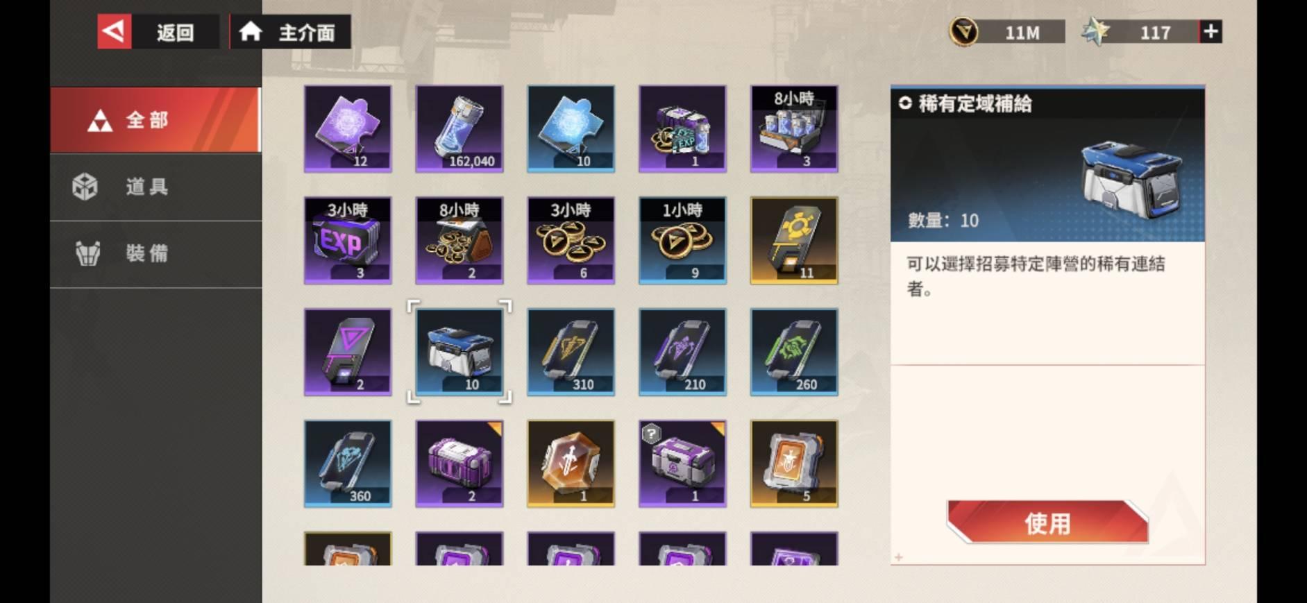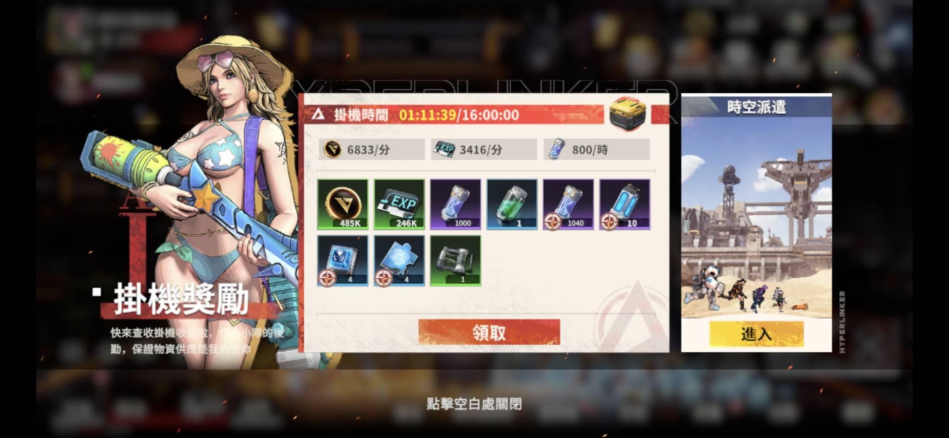 點開來查看和領取掛機資源,越後期掛機時間上限會越高,在「時空派遣」選擇要跑哪些資源。推薦優先跑空投信標,可以在主城畫面裡的空投補給開出以下道具: