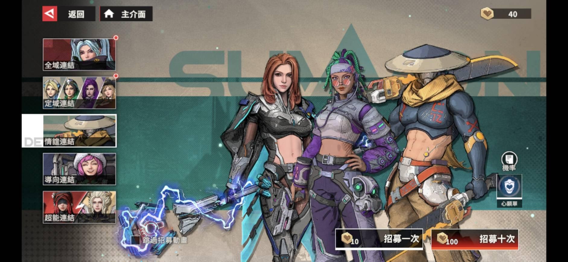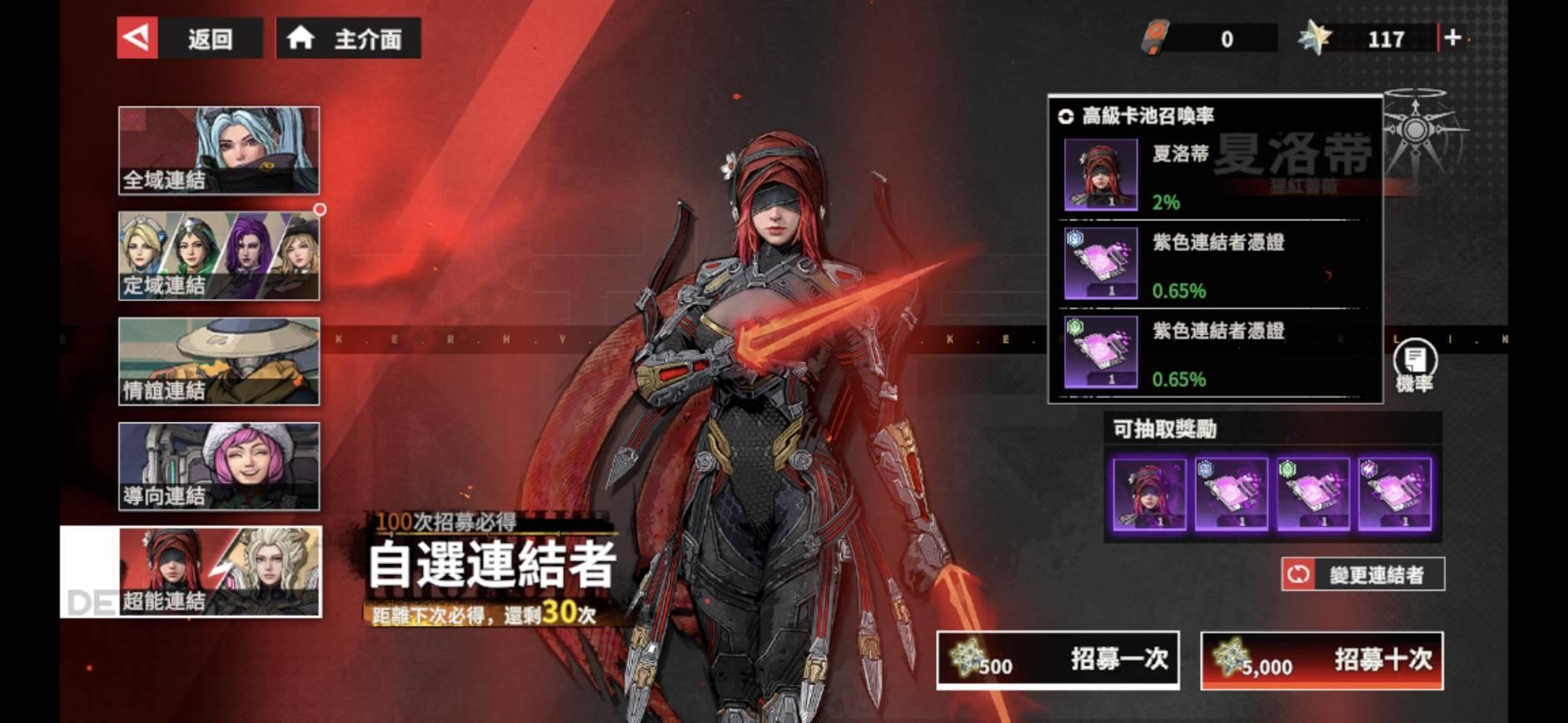 5.超能連結:1抽消耗500輝石,自選1個連結者(金紅藍綠紫黃),100次招募必得,指定角色2%、紫色連結者憑證0.65%,其他很多稀有資源,推薦輝石主力抽這裡。