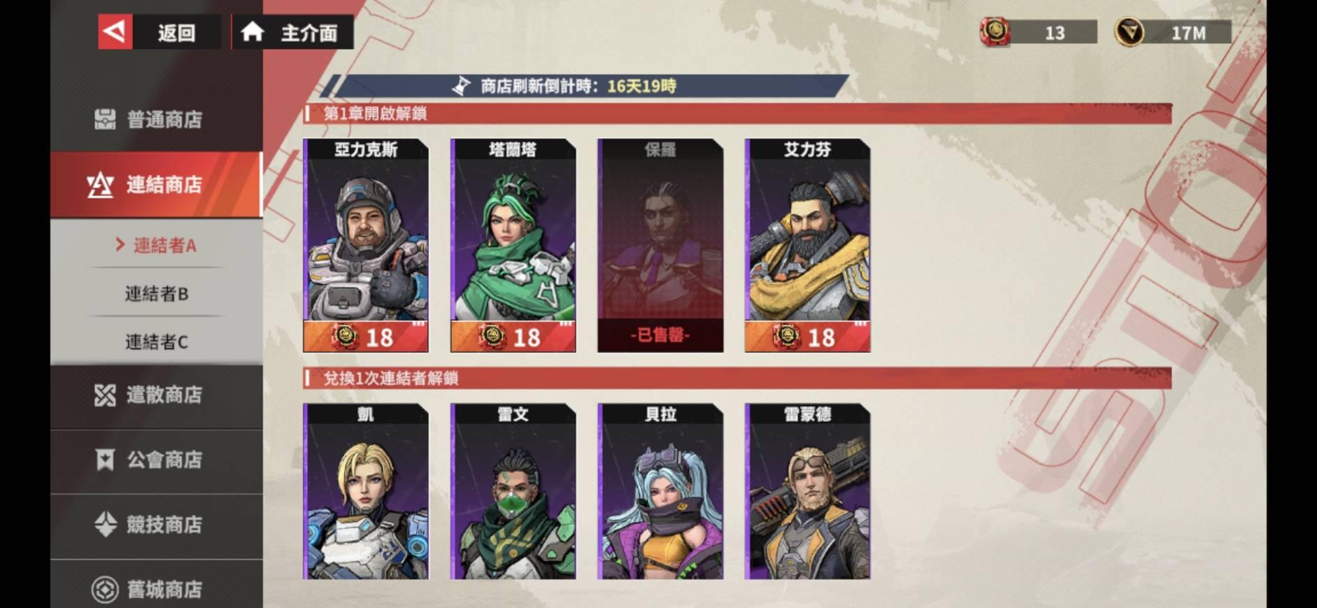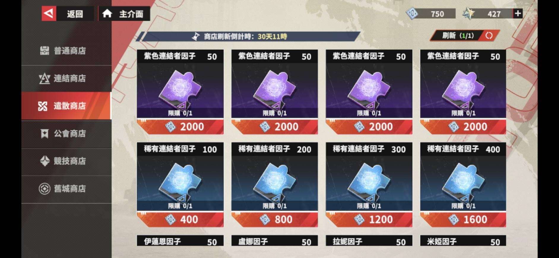 (2)連結商店:推測20天刷新,推測清單固定,用空投補給獲得的連結幣換角色,每次刷新每隻角色只能換1次。