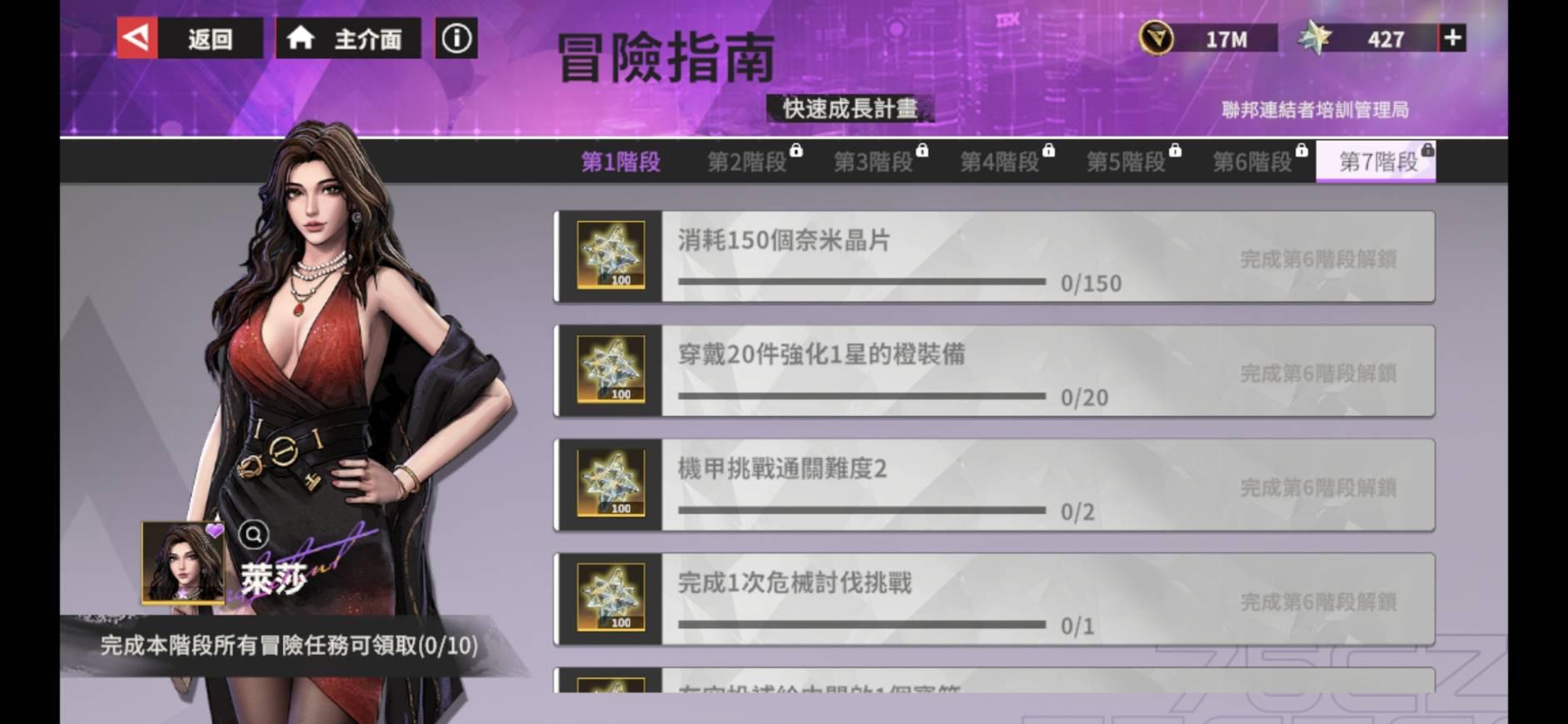 2.冒險指南:就是前期的每日目標,可以拿到很多連結憑證(抽卡券)(目前看到21天,每天10個紫色或橙色連結憑證共180個,第7、14天是塗鴉,第21天是副官)。
