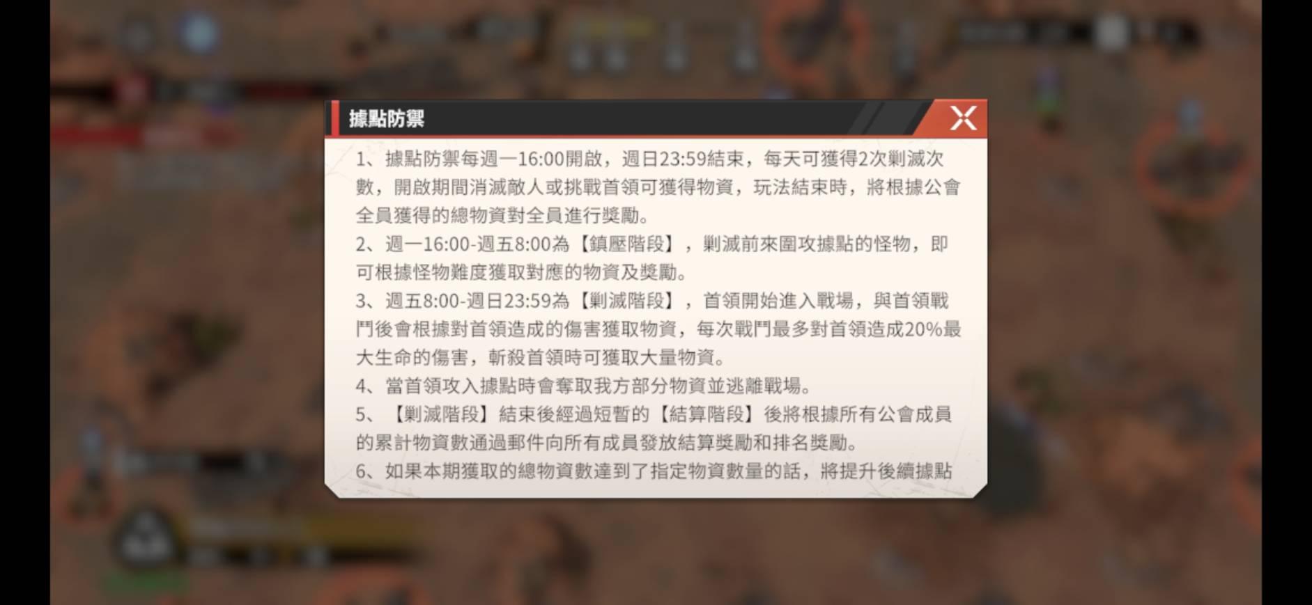 2.據點防禦:規則如下圖,首領目前玩是週五和週日分別出現2隻。