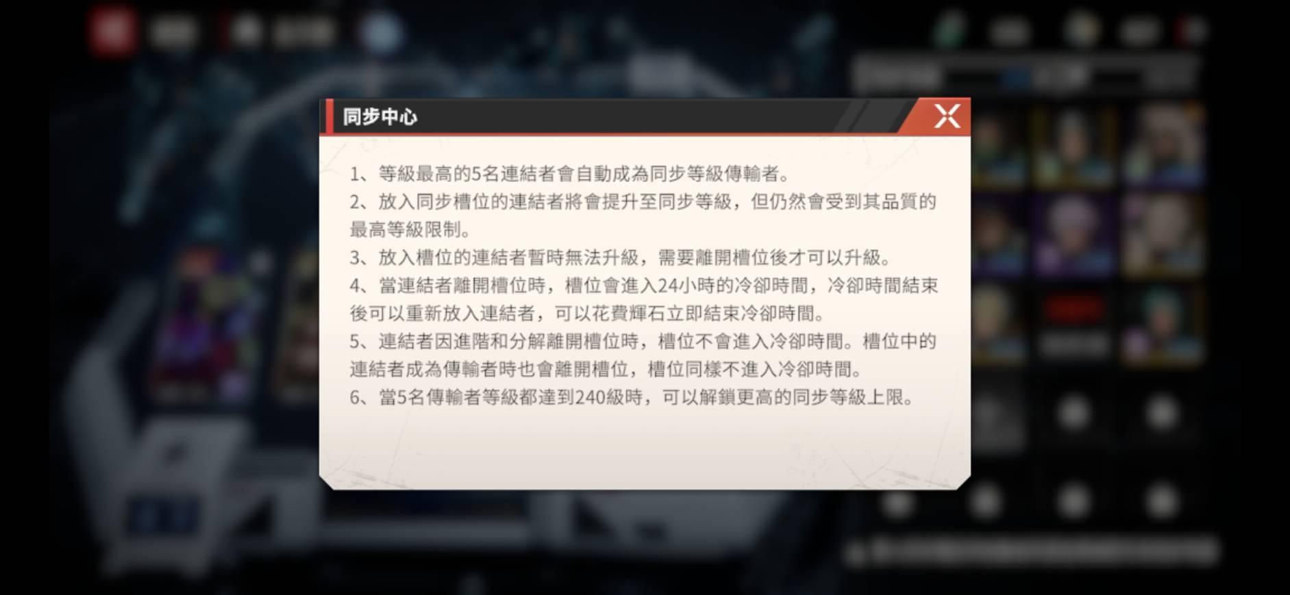 九、同步中心:角色等級只需要升5隻,其他角色用同步中心來同步等級,規則如下圖。